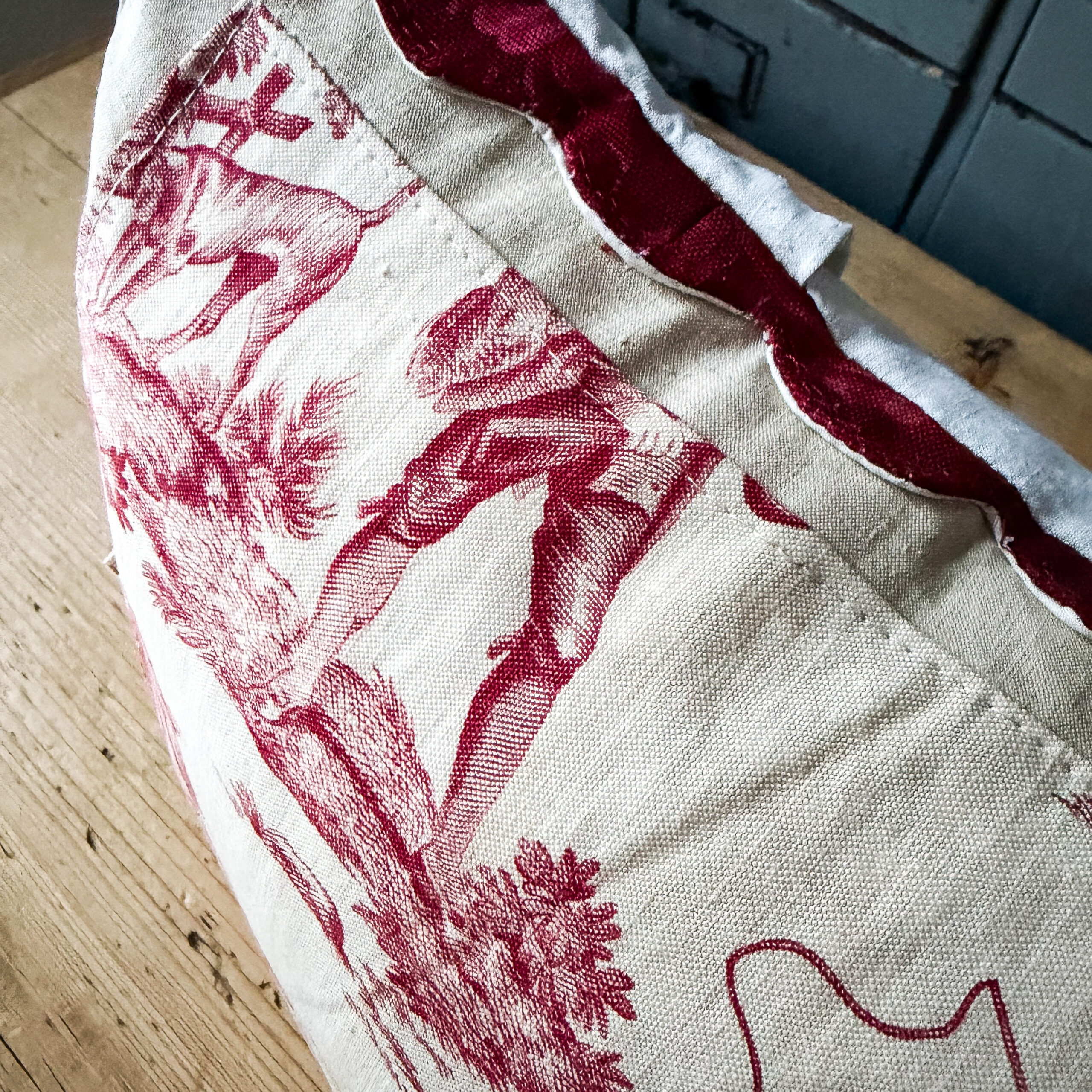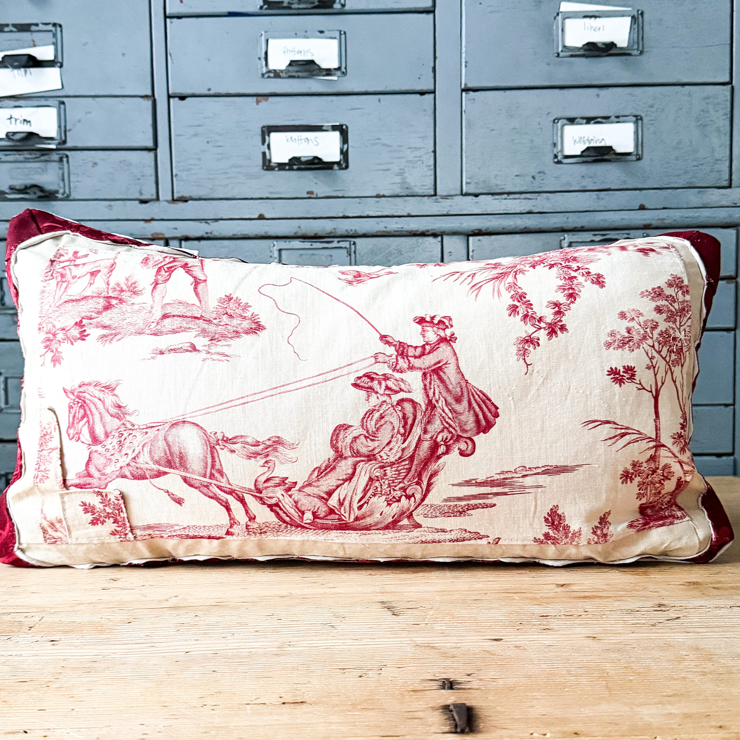 This handmade pillow was created with using antique French toile pieced together with other antique fabrics. It measures approximately 20 by 10 inches and comes with a feather insert. There are imperfections such as repairs, discoloration, and stains. The colors may appear slightly different in person. This is offered with free shipping in the US.
