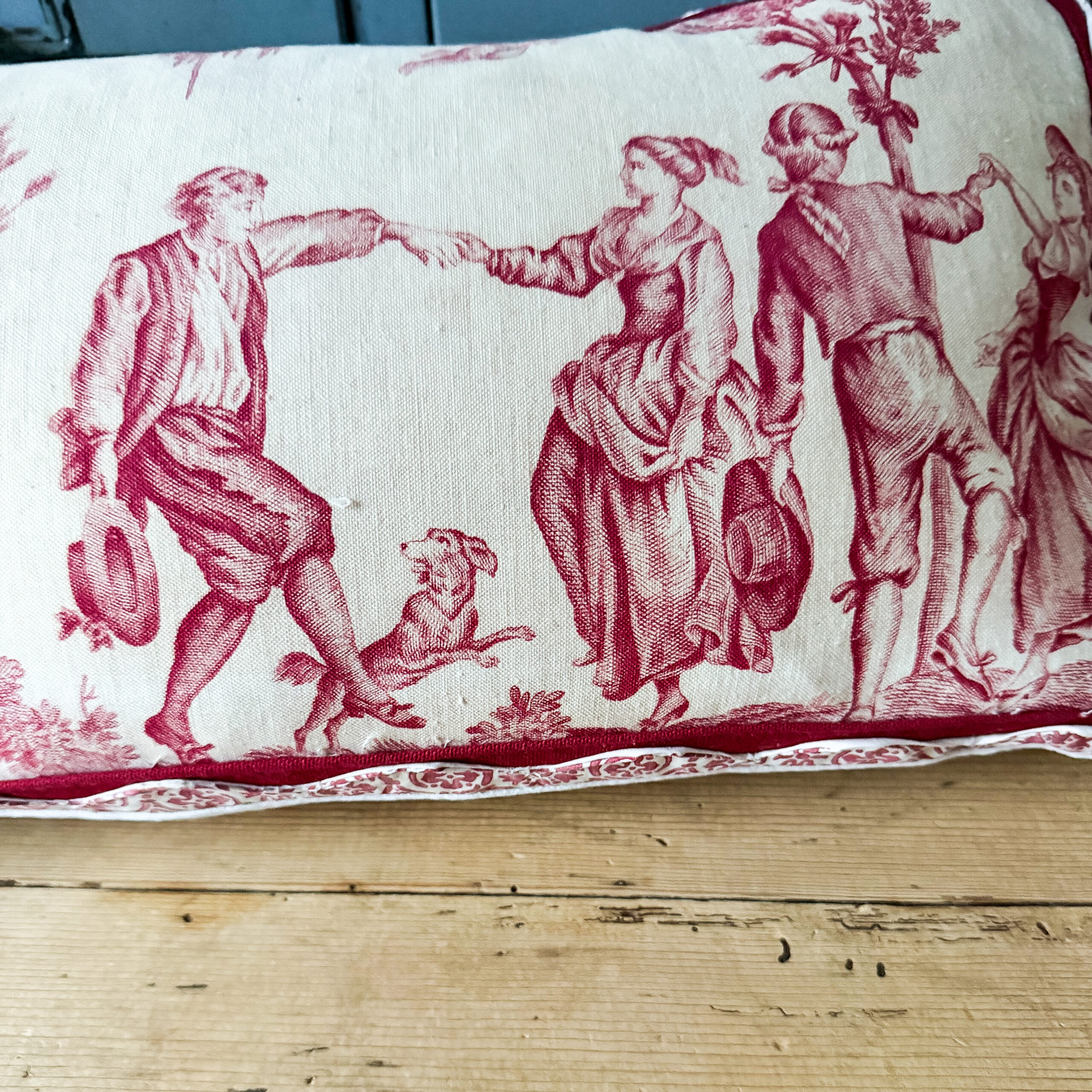 This handmade pillow was created with using antique French toile pieced together with other antique fabrics.  It measures approximately 19 by 10 inches and comes with a feather insert.  There are imperfections such as repairs, discoloration, and stains.  The colors may appear slightly different in person.  This is offered with free shipping in the US.