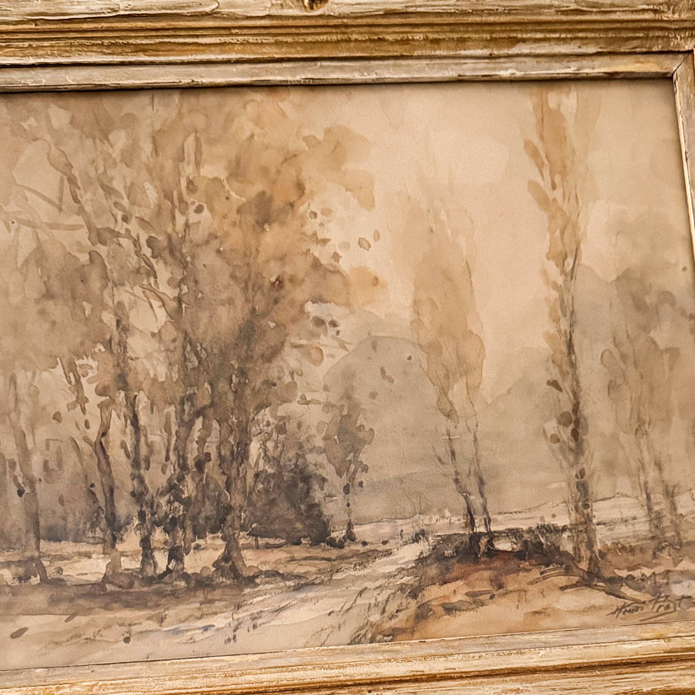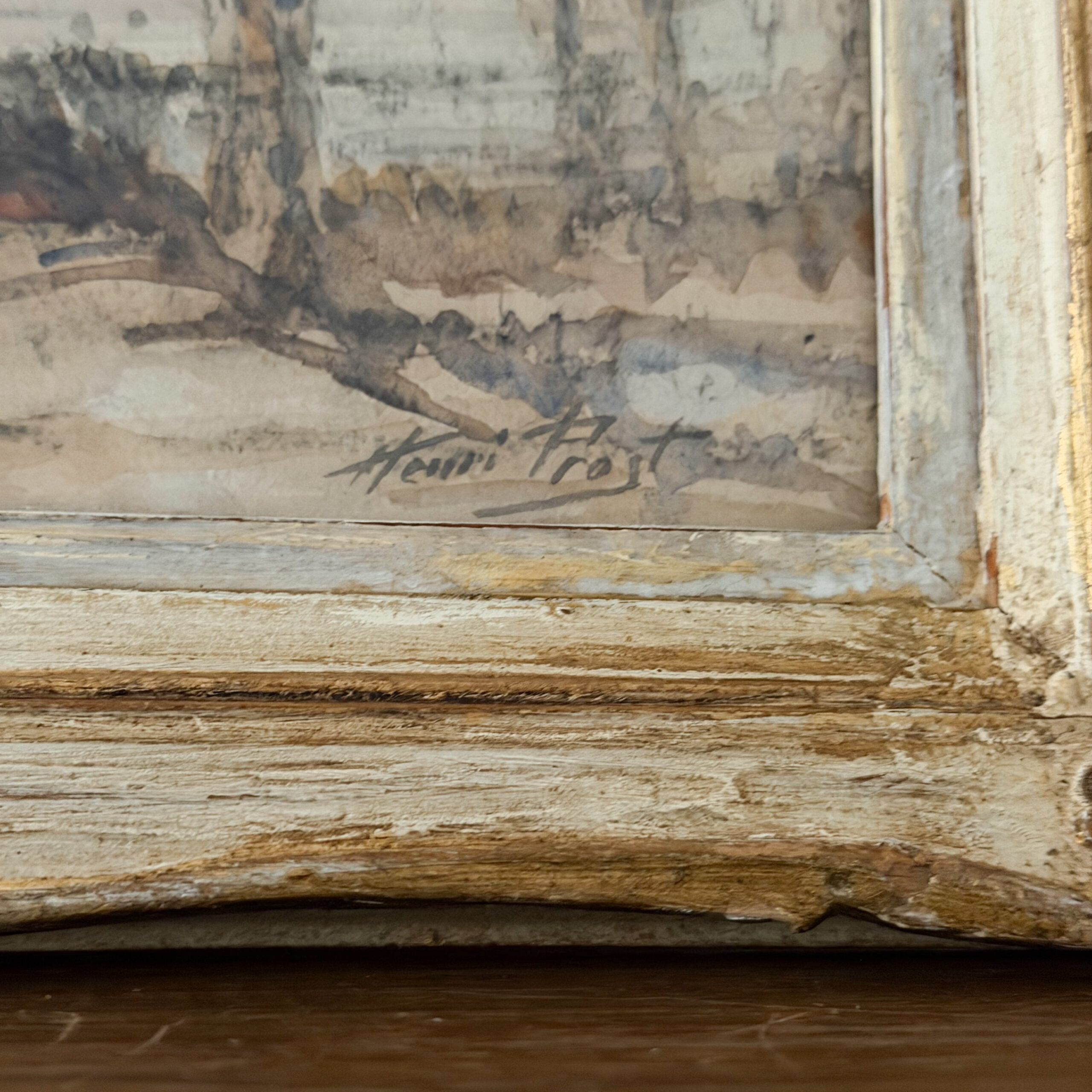 This is in an antique French watercolor of a winter scene. It measures approximately 16 3/4 inches by 13 1/2 inches. There could be imperfections such as discoloration or chips in the frame, these due to the age of the piece. Colors may appear slightly different in person. This is offered with free shipping in the US, please reach out if you would like international shipping.