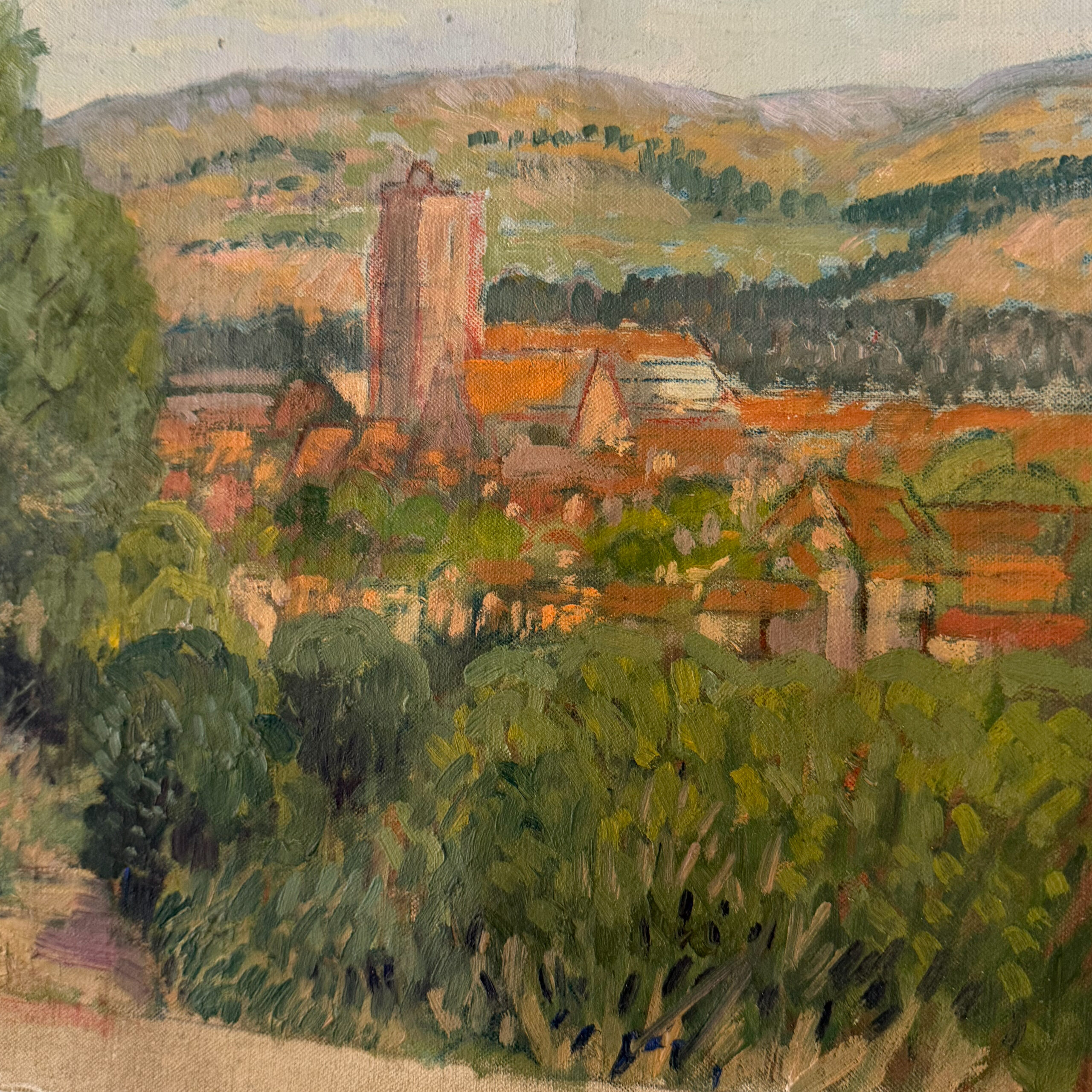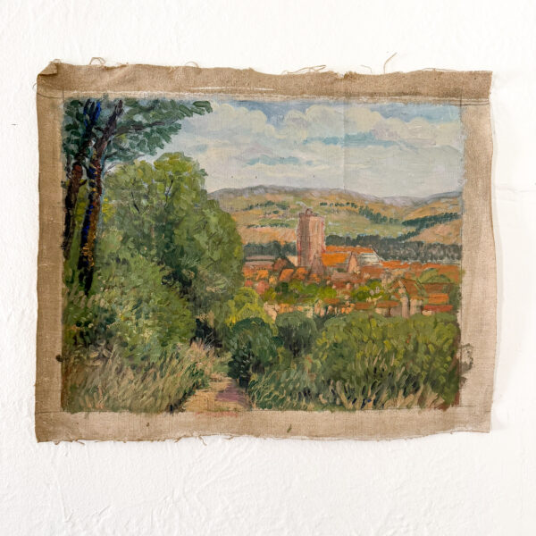 This antique painting was found in Paris and is on canvas and measures 18.5 by 15 inches. It comes unframed, I have temporarily secured to wall with painters tape, but it could be framed, pinned or clipped up to wall. This is in found condition with the charm that comes with age and history; there is some damage to the edges of the canvas, a crease through the painting, and there could be some scratches and there maybe stains or discoloration. Colors may appear slightly different in person.
