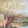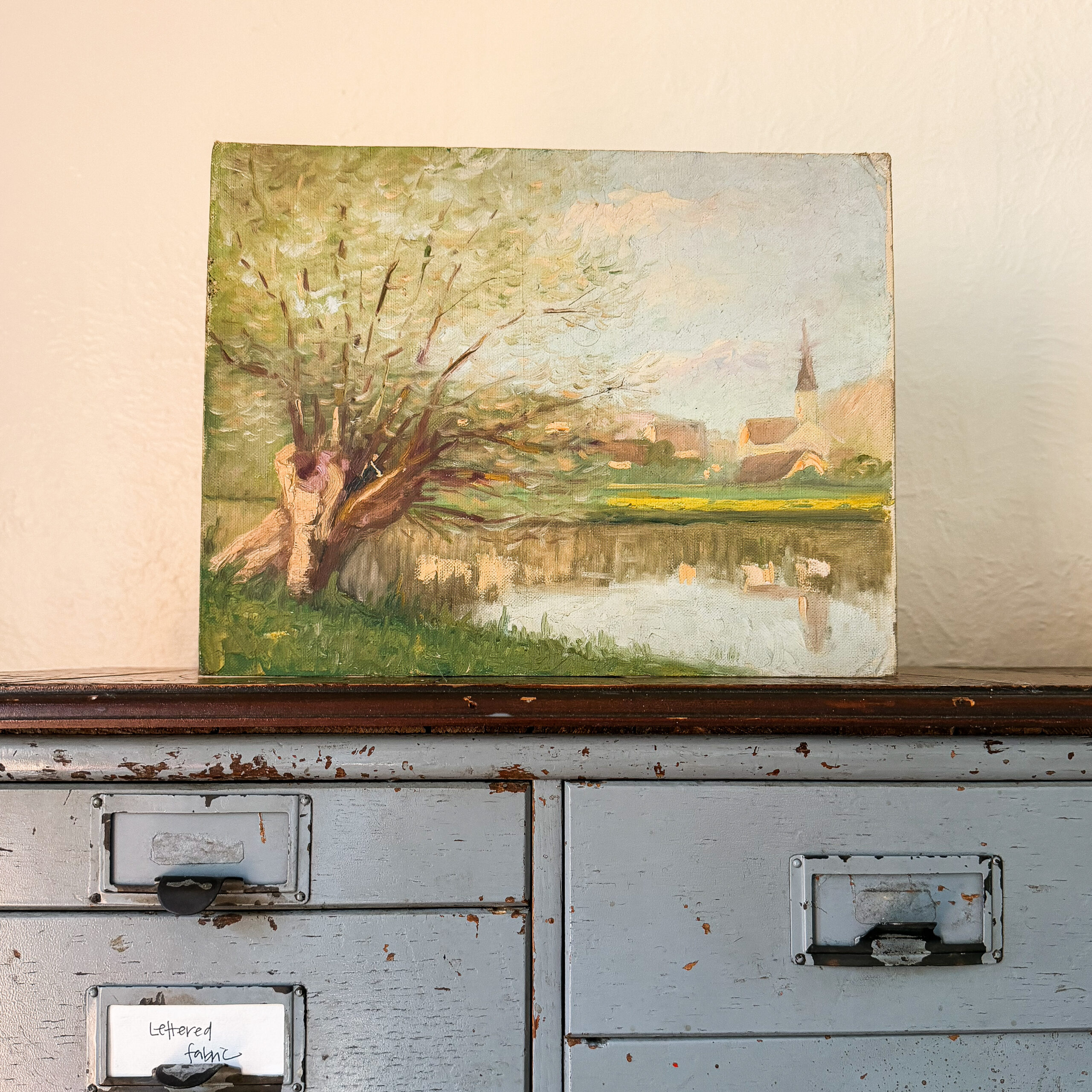 This antique painting was found in Paris and is on canvas wrapped around cardboard. It measures 13 3/4 by 10 1/2 inches. This is in found condition with the charm that comes with age and history; there is some damage to the edges and corners, and there could be some scratches and there maybe stains or discoloration. Colors may appear slightly different in person.