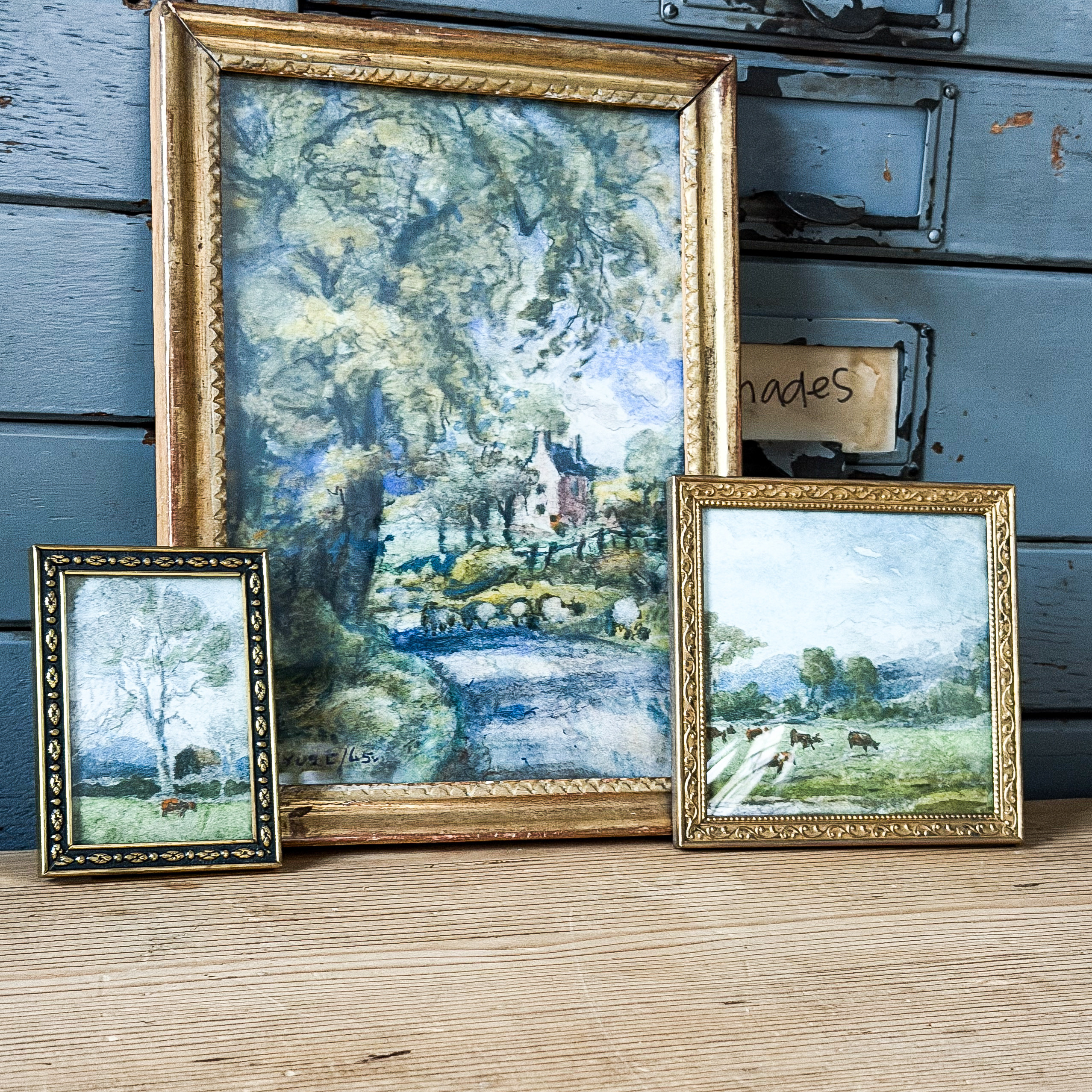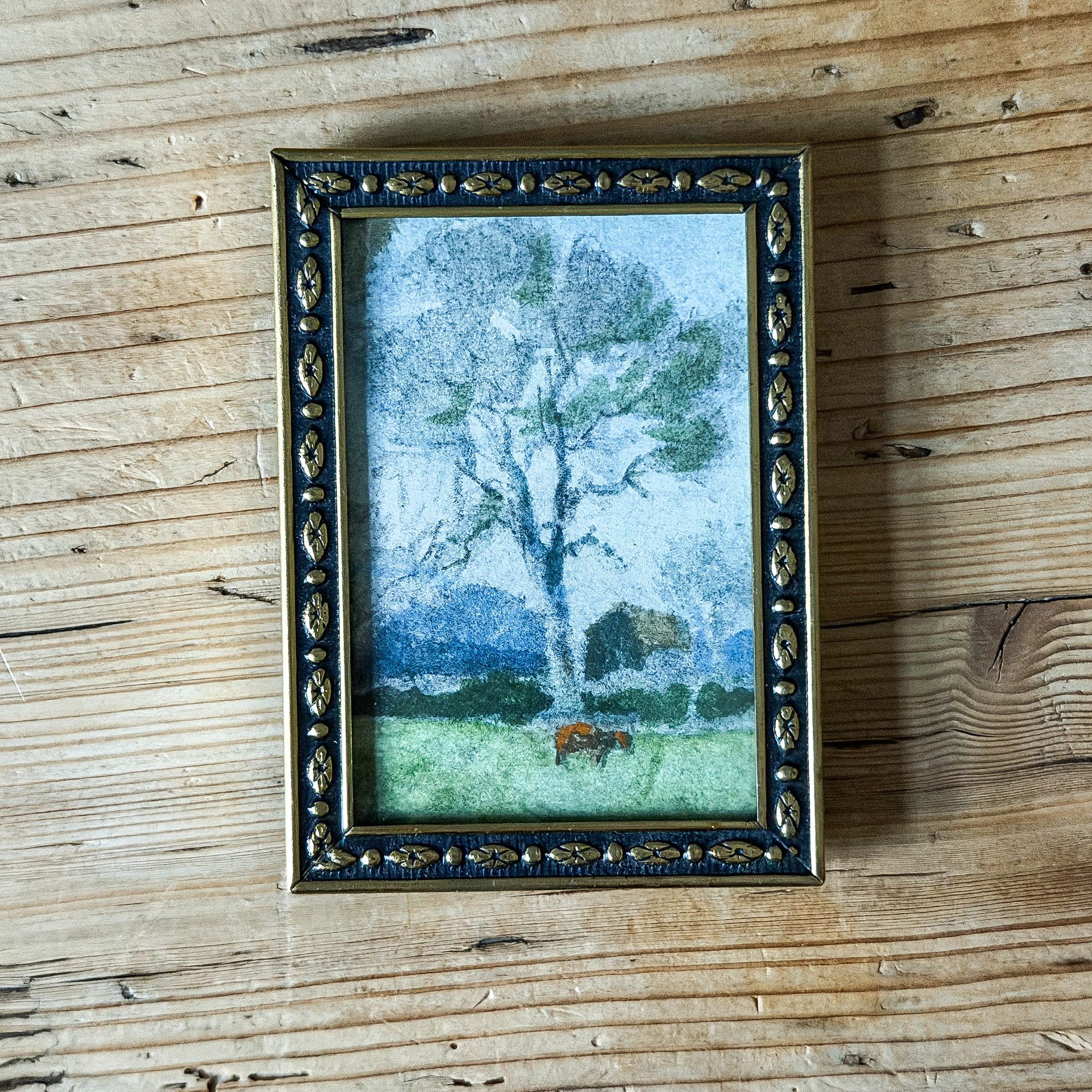 This small charming watercolor was found in England.  It measure approximately 3  by 2  inches with the frame.  Both the frame and painting have a history so there are imperfections such as chipping and discoloration with the paint on the frame.  The colors may appear slightly different in person.  This is offered with free shipping in the US.