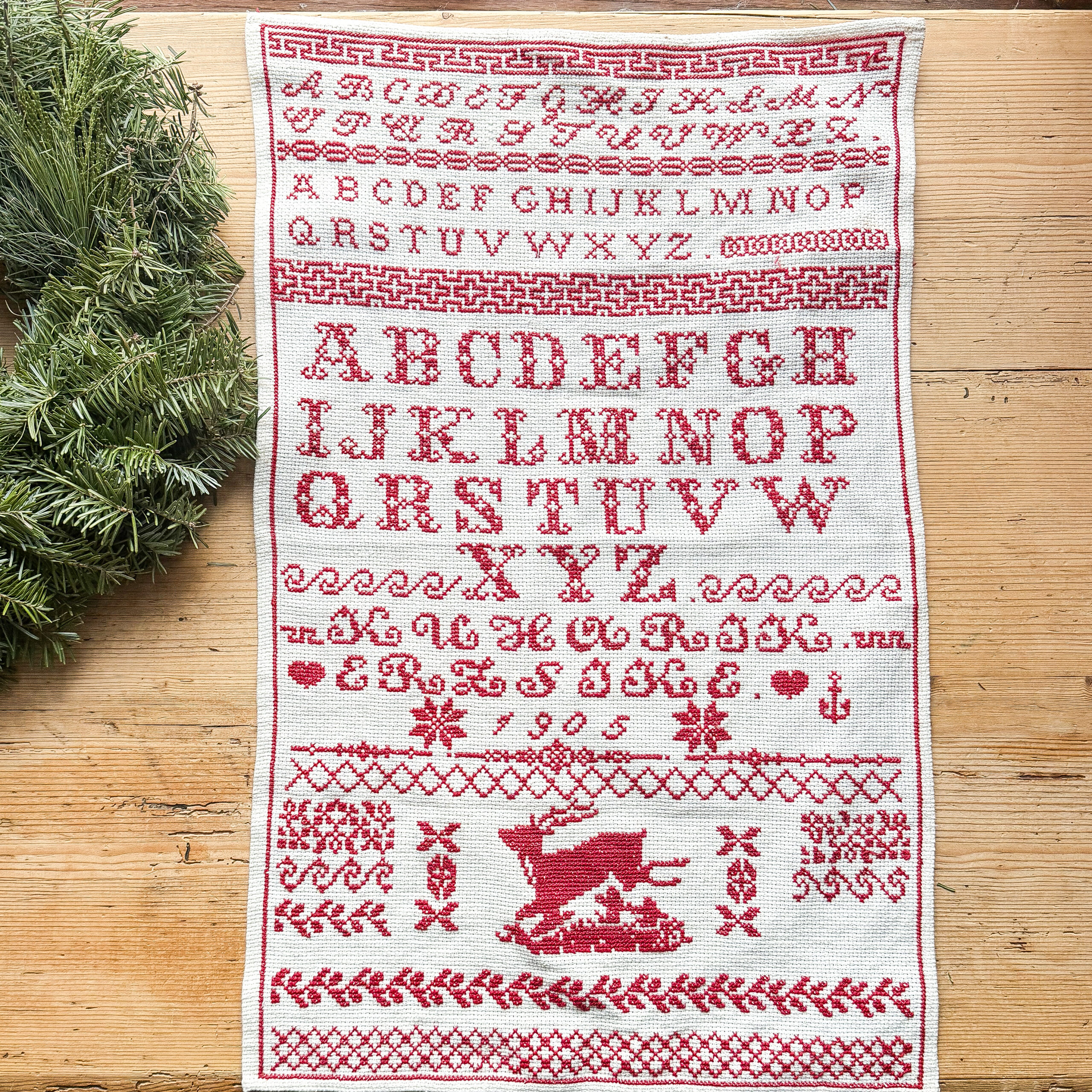 This is a lovely sampler that was found in England. It measures 15 1/2 by 24 inches. It appears to be in excellent condition, but this is an older piece and may have imperfections such as light stains. Colors may appear slightly different in person. This is offered with free shipping in the US.