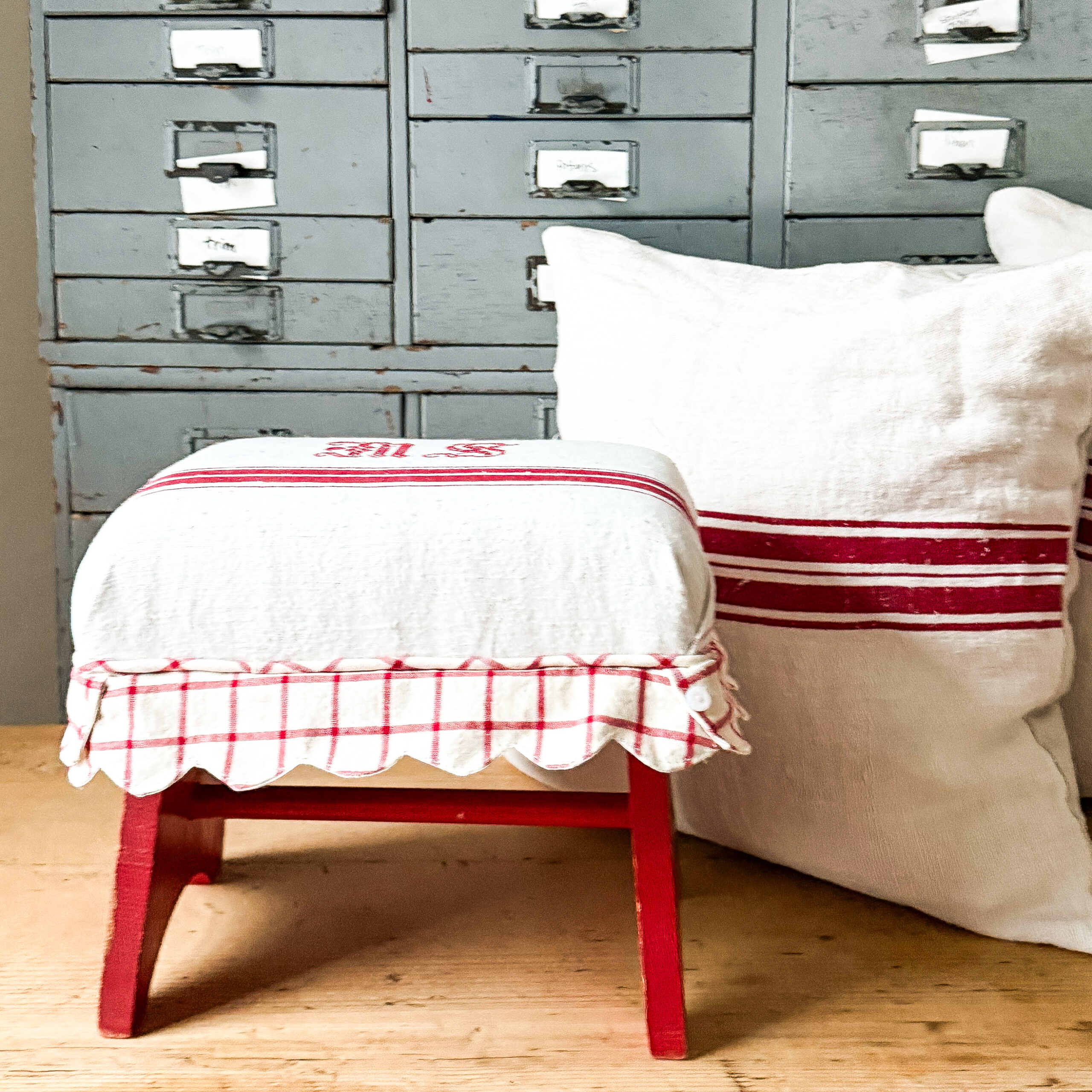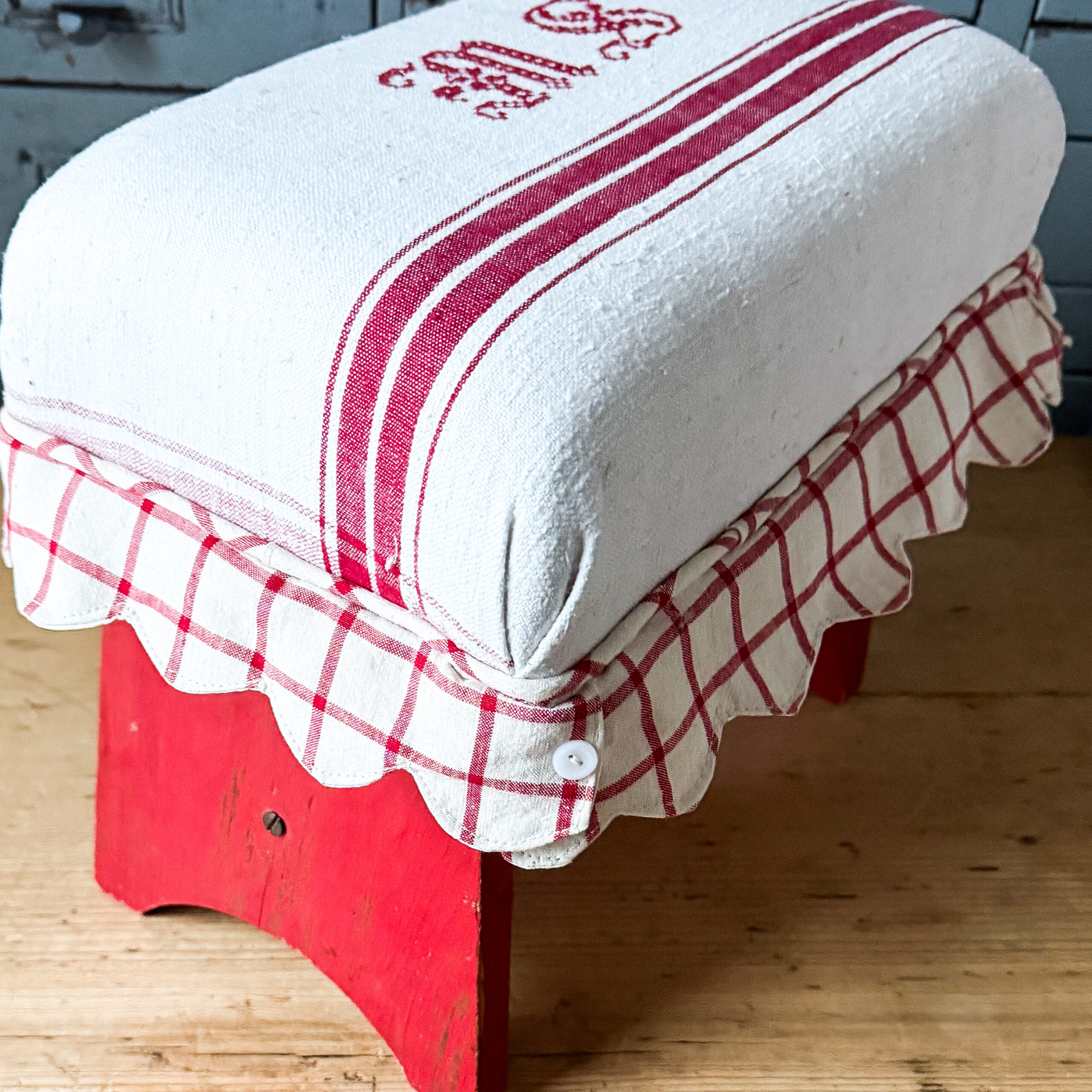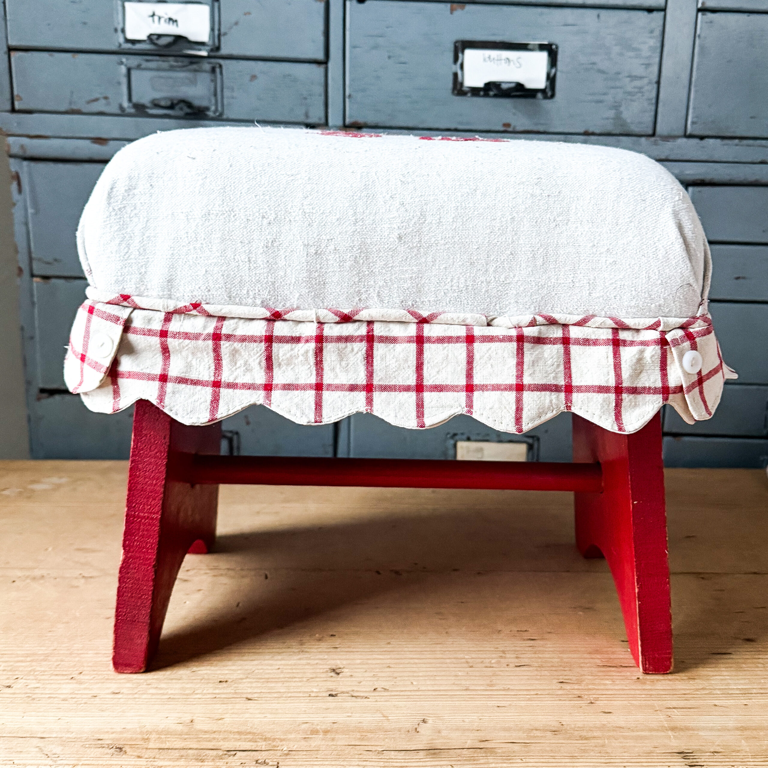 This footstool was upholstered in vintage European hemp linen.  It measures approximately 10 3/4 inches high and 11 1/2 across and 7 inches deep.  This is perfectly imperfect upholstered with fabric with a history, there could be light stains and repairs.  There is chipping with the paint, and there is very slight wobble with the stool, I barely noticed while reupholstering, it is sturdy, but I just wanted to offer full disclosure.  The colors may appear slightly different in person.  This is offered with free shipping in the US>