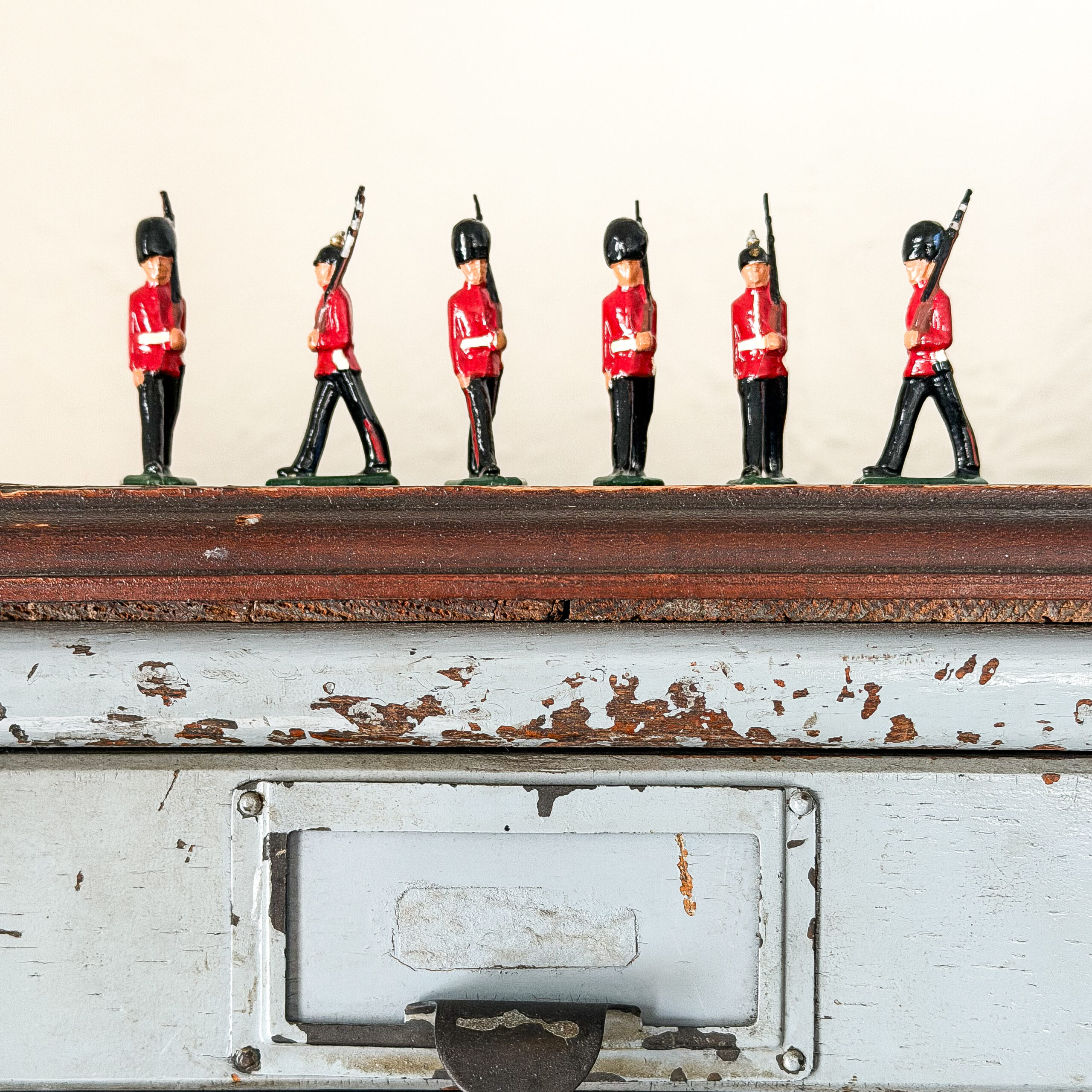 These vintage soldiers were found in England. They measure approximately 1 3/4 inches high. These are for decor purposes only, as the paint is old, DO NOT USE FOR TOYS. These have charming imperfections due to the age such as chipping of the paint and possibly broken swords or guns. The colors may appear slightly different in person. These are offered with free shipping in the US.