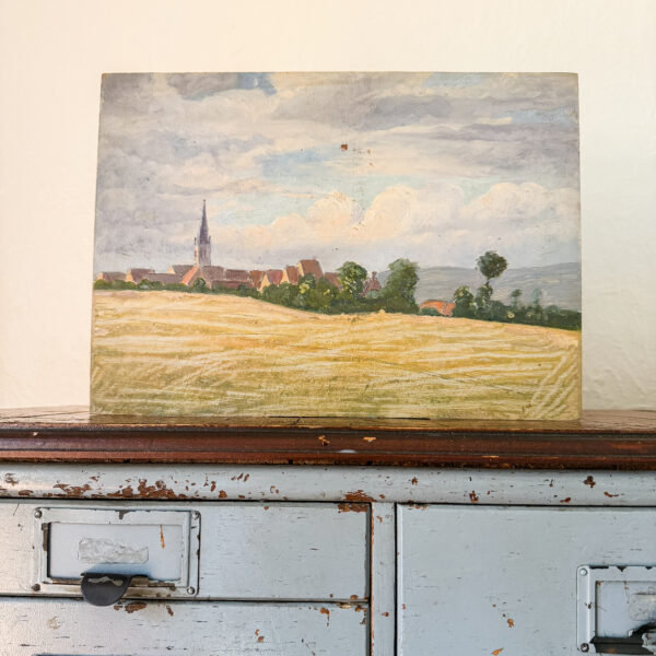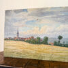 This lovely impressionist style painting was found in Paris and measures 13 by 9 1/2 inches. It was painted on wood. Please note this is in found condition so it may have some imperfections such as a scratch in the sky part and some discolorations or marks. Also note the colors may appear slightly different in person.