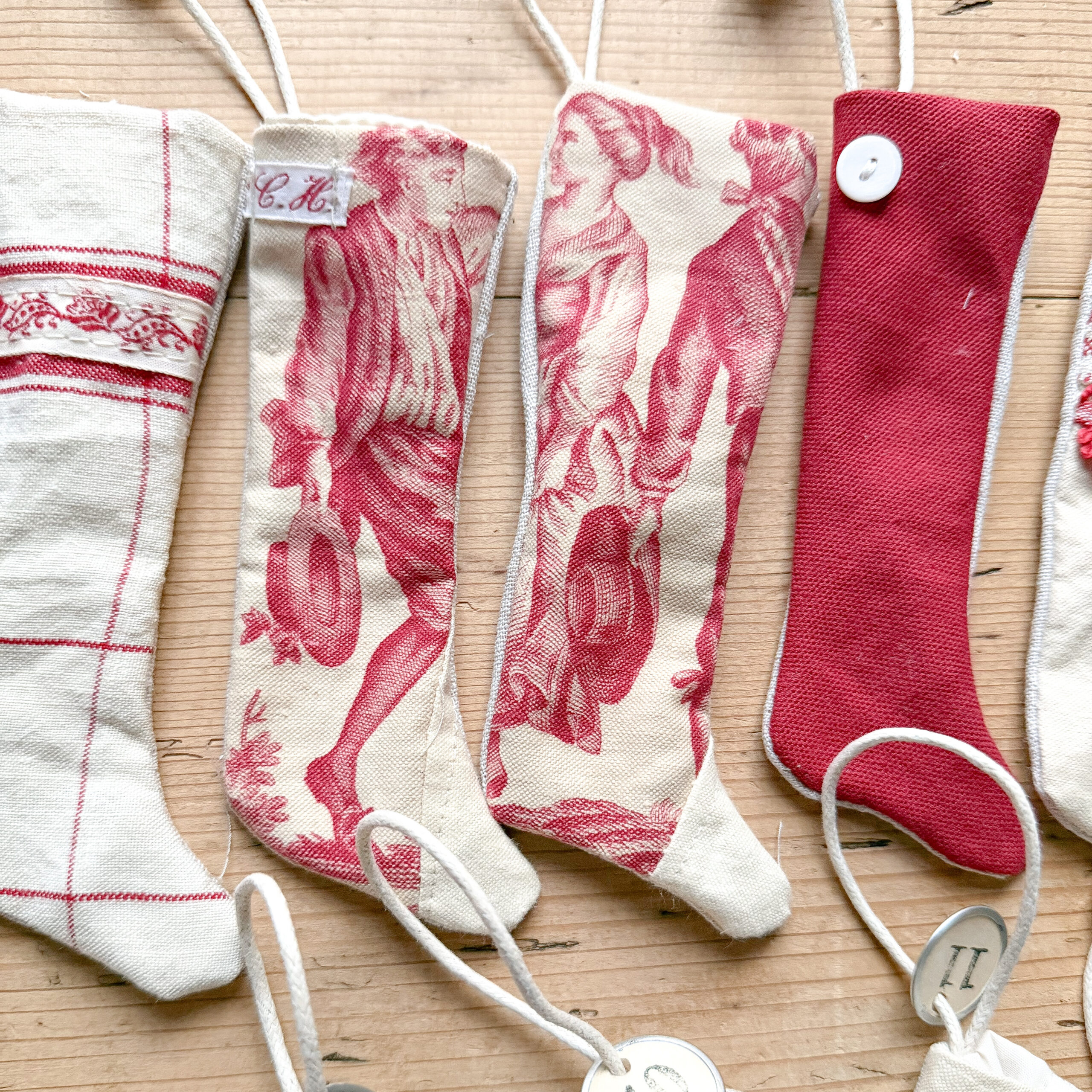 This handmade set of tiny stockings, was created using pieces of an antique French toile and some vintage European fabrics. There are some modern day textiles and embellishments added in. Each one was handcrafted to highlight these textiles of the past and give them a new life. There maybe imperfections such as stains, repairs, and patches due the fabrics history and the handmade nature, we believe this adds to the charm and uniqueness of each stocking. ****** There are imperfections due to the age of the fabric, such as yellow spots on the cream fabric, it was difficult to get accurate picture of this. There could be other imperfections such as repairs and other stains*** Colors may appear slightly different in person.*** Each stocking measures approximately 5-7 inches in length not including the hanging string and 1.5-2.5 inches across.