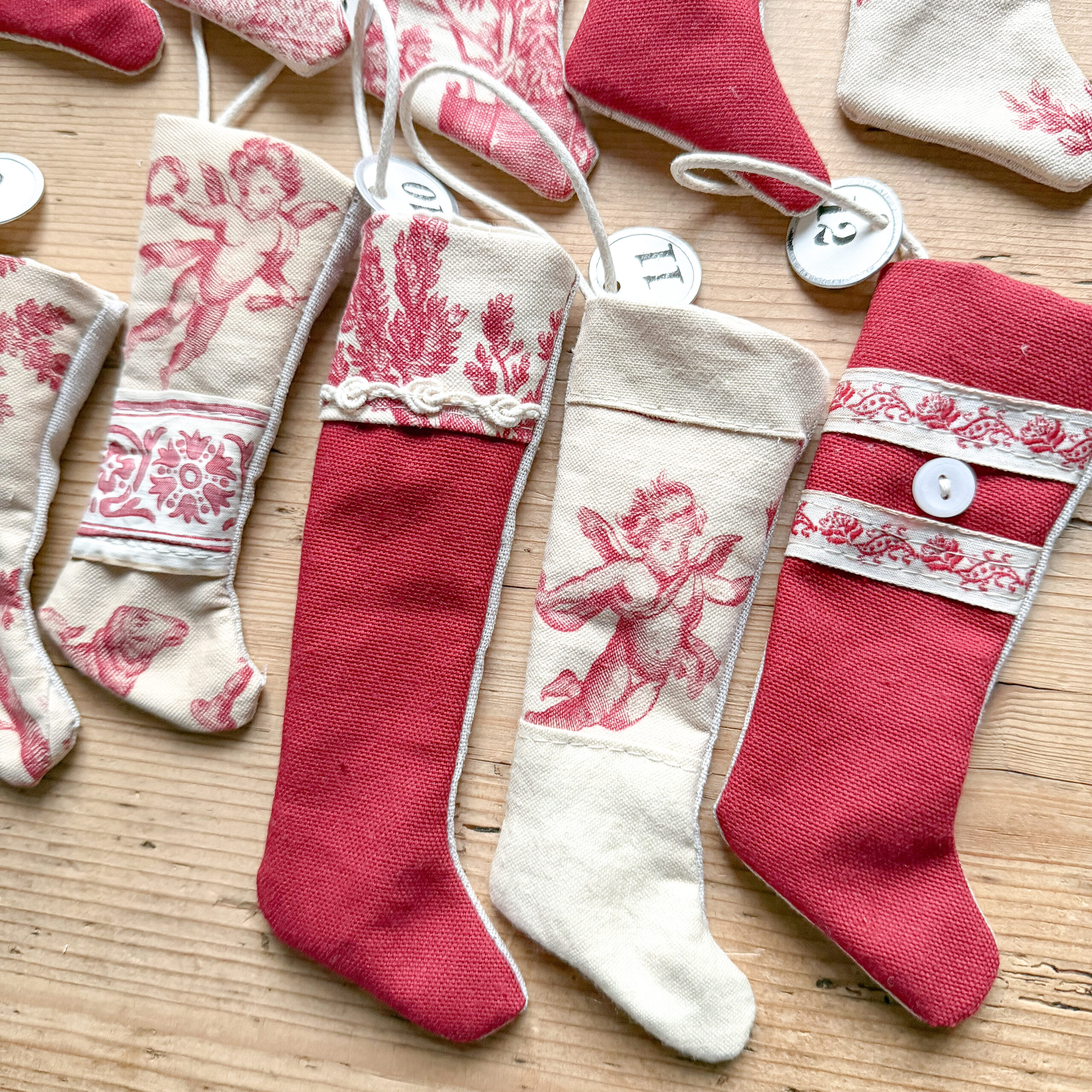 This handmade set of tiny stockings, was created using pieces of an antique French toile and some vintage European fabrics. There are some modern day textiles and embellishments added in. Each one was handcrafted to highlight these textiles of the past and give them a new life. There maybe imperfections such as stains, repairs, and patches due the fabrics history and the handmade nature, we believe this adds to the charm and uniqueness of each stocking. ****** There are imperfections due to the age of the fabric, such as yellow spots on the cream fabric, it was difficult to get accurate picture of this. There could be other imperfections such as repairs and other stains*** Colors may appear slightly different in person.*** Each stocking measures approximately 5-7 inches in length not including the hanging string and 1.5-2.5 inches across. Free shipping is offered in the United States, please email for an international shipping quote.