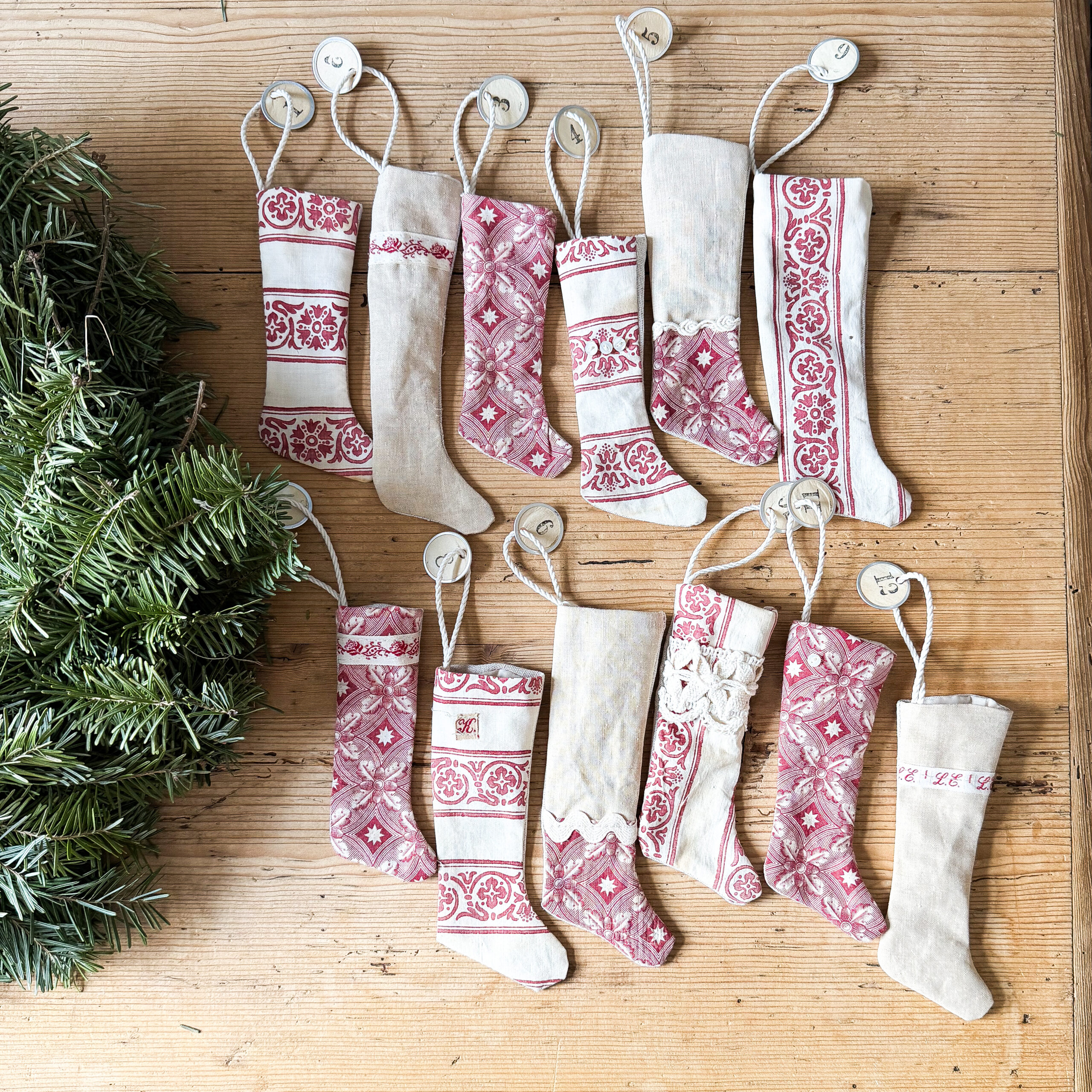 This handmade set of tiny stockings, was created using pieces of an antique French fabric and some vintage European fabrics. There are some modern day textiles and embellishments added in. Each one was handcrafted to highlight these textiles of the past and give them a new life. There maybe imperfections such as stains, repairs, and patches due the fabrics history and the handmade nature, we believe this adds to the charm and uniqueness of each stocking. ****** There are imperfections due to the age of the fabric, there could be other imperfections such as repairs and other stains*** Colors may appear slightly different in person.*** Each stocking measures approximately 5-7 inches in length not including the hanging string and 1.5-2.5 inches across. Free shipping is offered in the United States, please email for an international shipping quote.