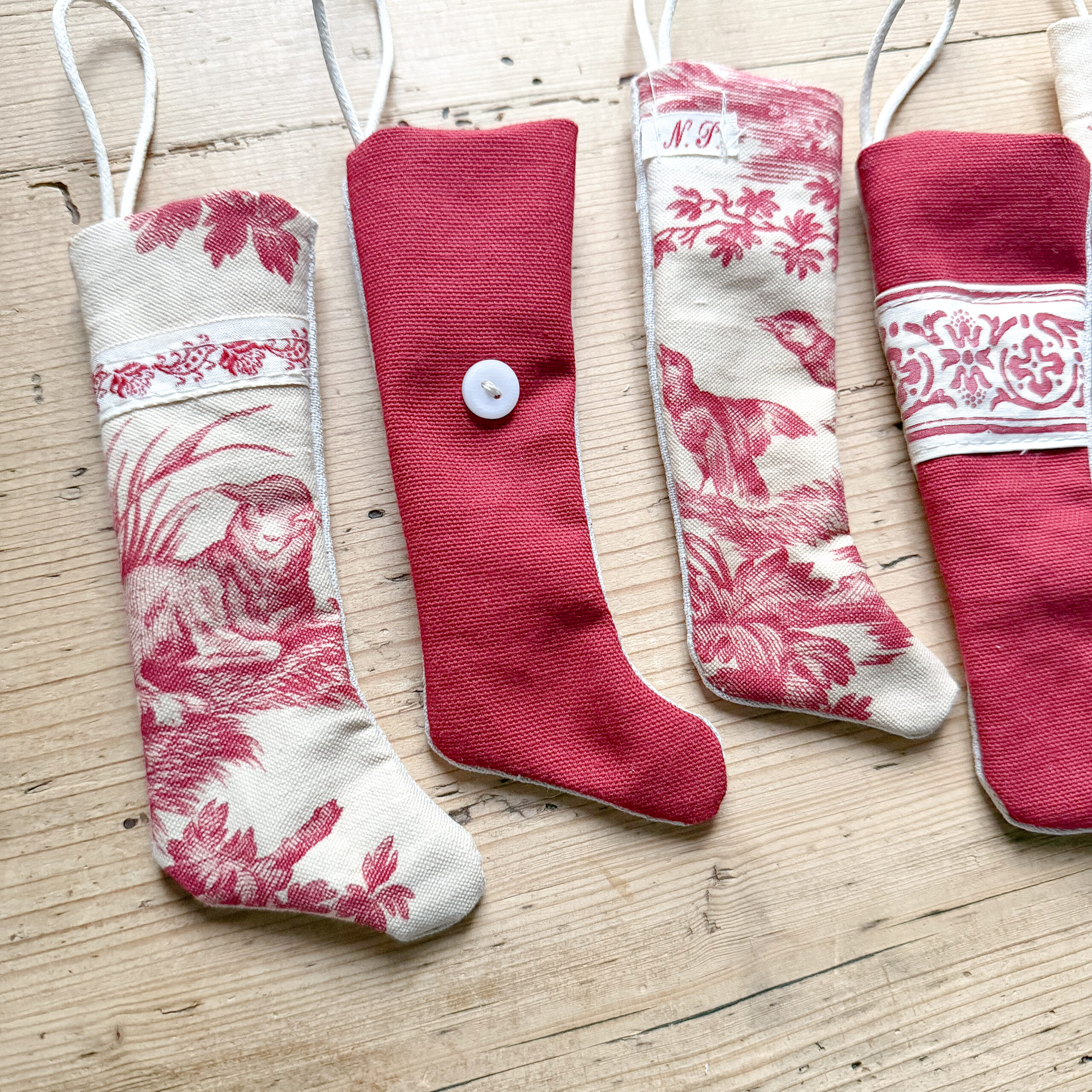 This handmade set of tiny stockings, was created using pieces of an antique French toile  and some vintage European fabrics.  There are some modern day textiles and embellishments added in.  Each one was handcrafted to highlight these textiles of  the past and give them a new life.  There maybe imperfections such as stains, repairs, and patches due the fabrics history and the handmade nature, we believe this adds to the charm and uniqueness of each stocking. ****** There are imperfections due to the age of the fabric, such as yellow spots on the cream fabric, it was difficult to get accurate picture of this. There could be other imperfections such as repairs and other stains***  Colors may appear slightly different in person.***  Each stocking measures approximately 5-7 inches in length not including the hanging string and 1.5-2.5 inches across. Free shipping is offered in the United States, please email for an international shipping quote.