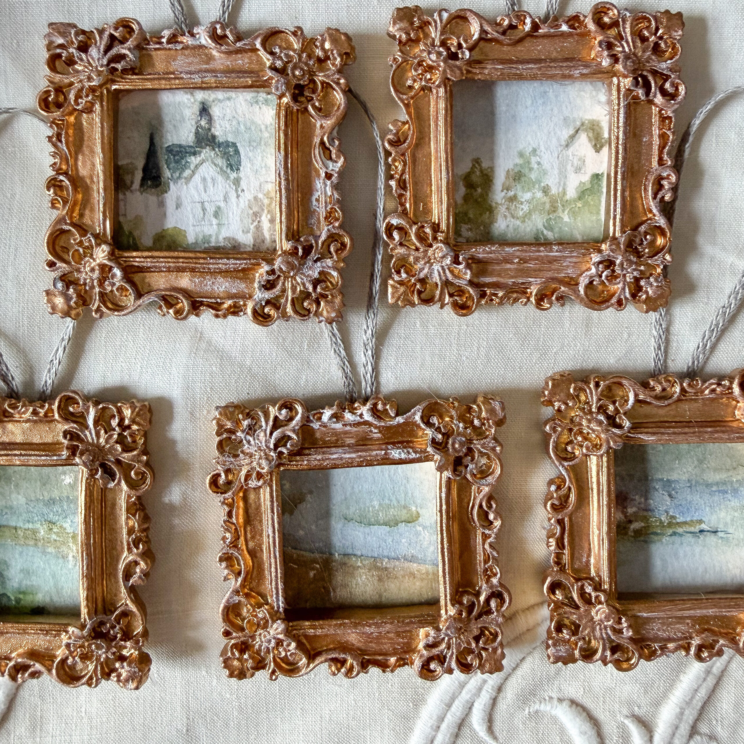 This set of ornaments was created using parts of a vintage English watercolor landscape. The frames are modern day and measure the tallest 2 inches and the widest 2 inches. These are handmade and each is unique and could have small imperfections. These are offered with free shipping in the US. Colors may appear slightly different in person.