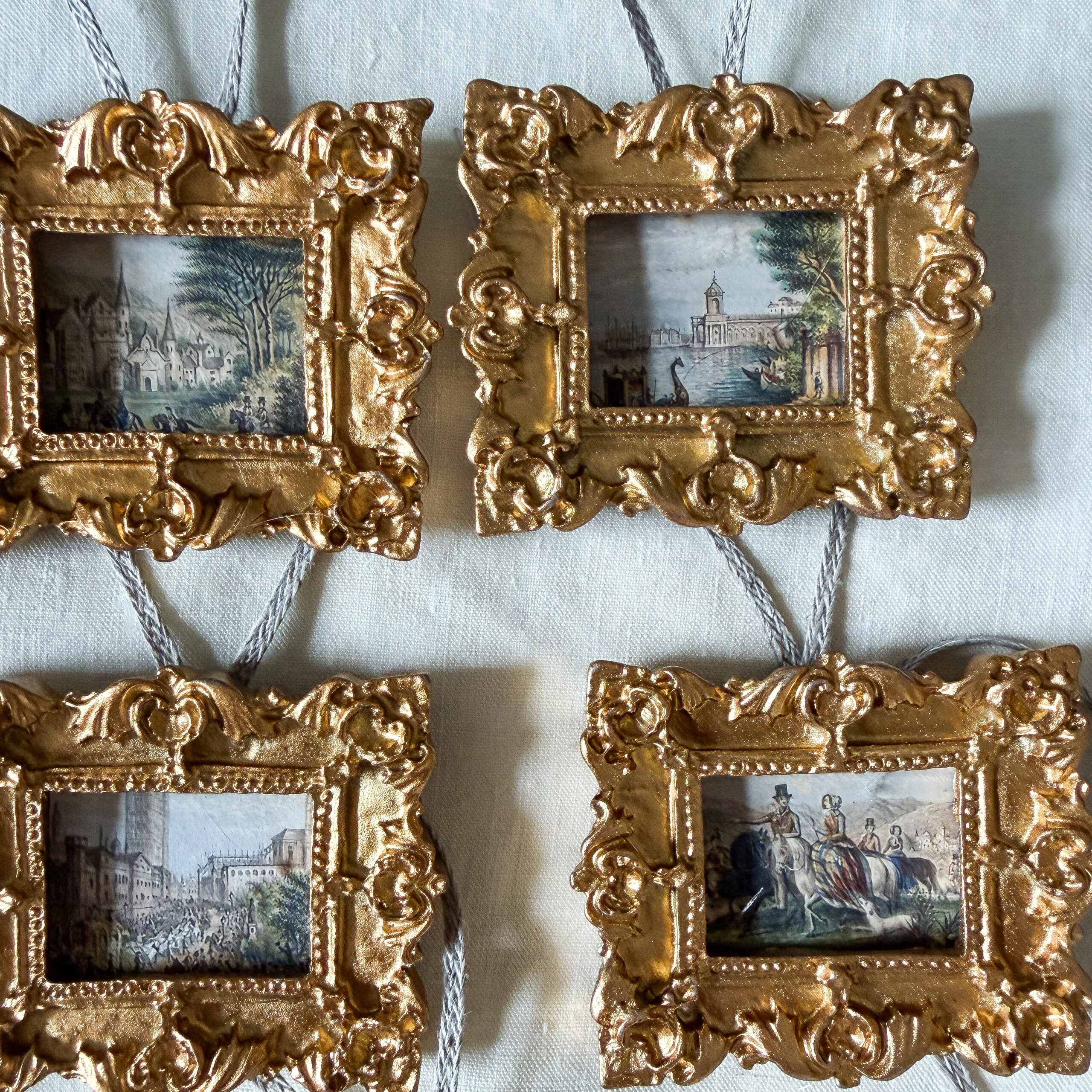 This set of ornaments was created using parts of tiny antique advertising prints. The frames are modern day and measure the tallest 2 inches and the widest 2 inches. These are handmade and each is unique and could have small imperfections. These are offered with free shipping in the US. Colors may appear slightly different in person.