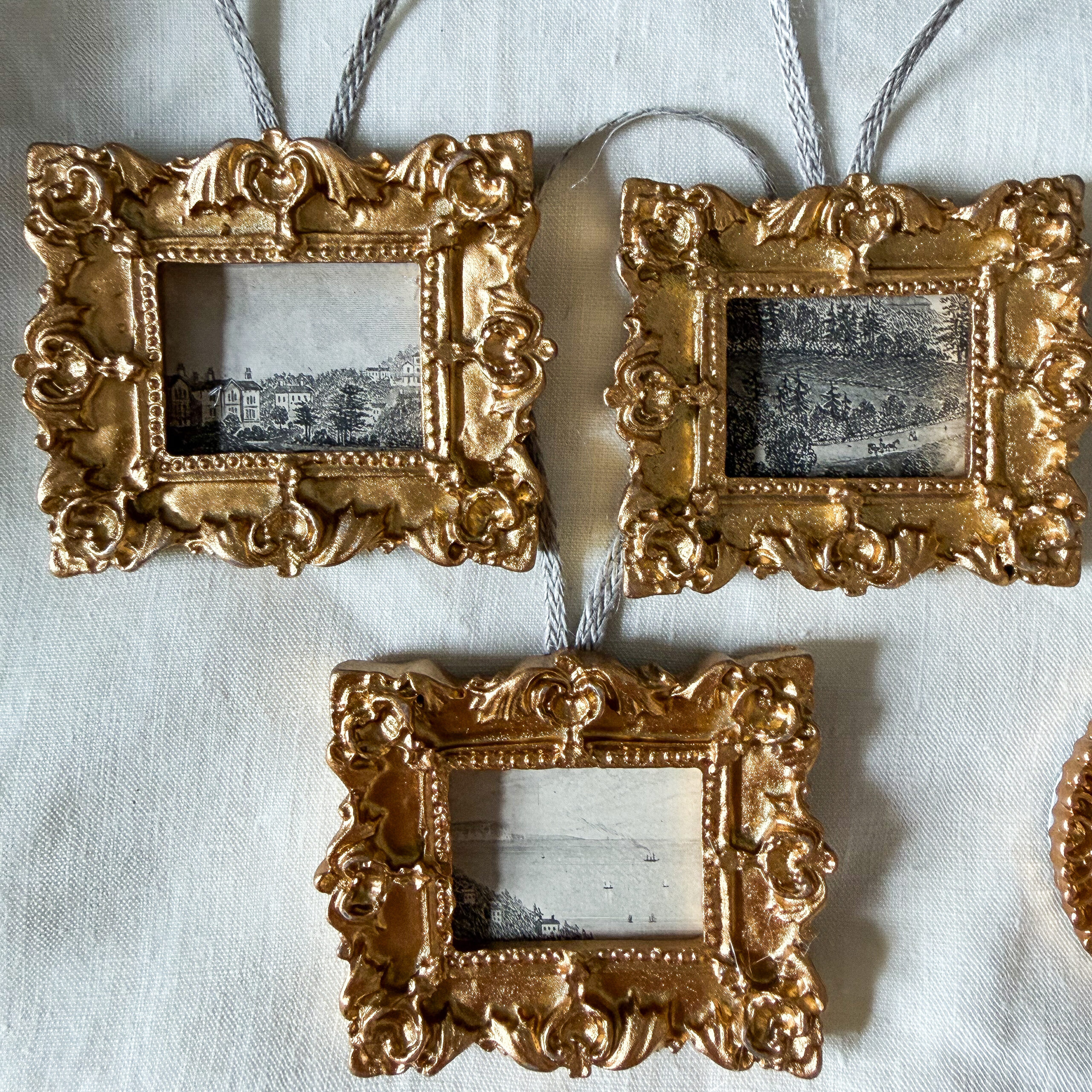 This set of ornaments was created using parts of tiny English etchings. The frames are modern day and measure the tallest 2 inches and the widest 2 inches. These are handmade and each is unique and could have small imperfections. These are offered with free shipping in the US. Colors may appear slightly different in person.