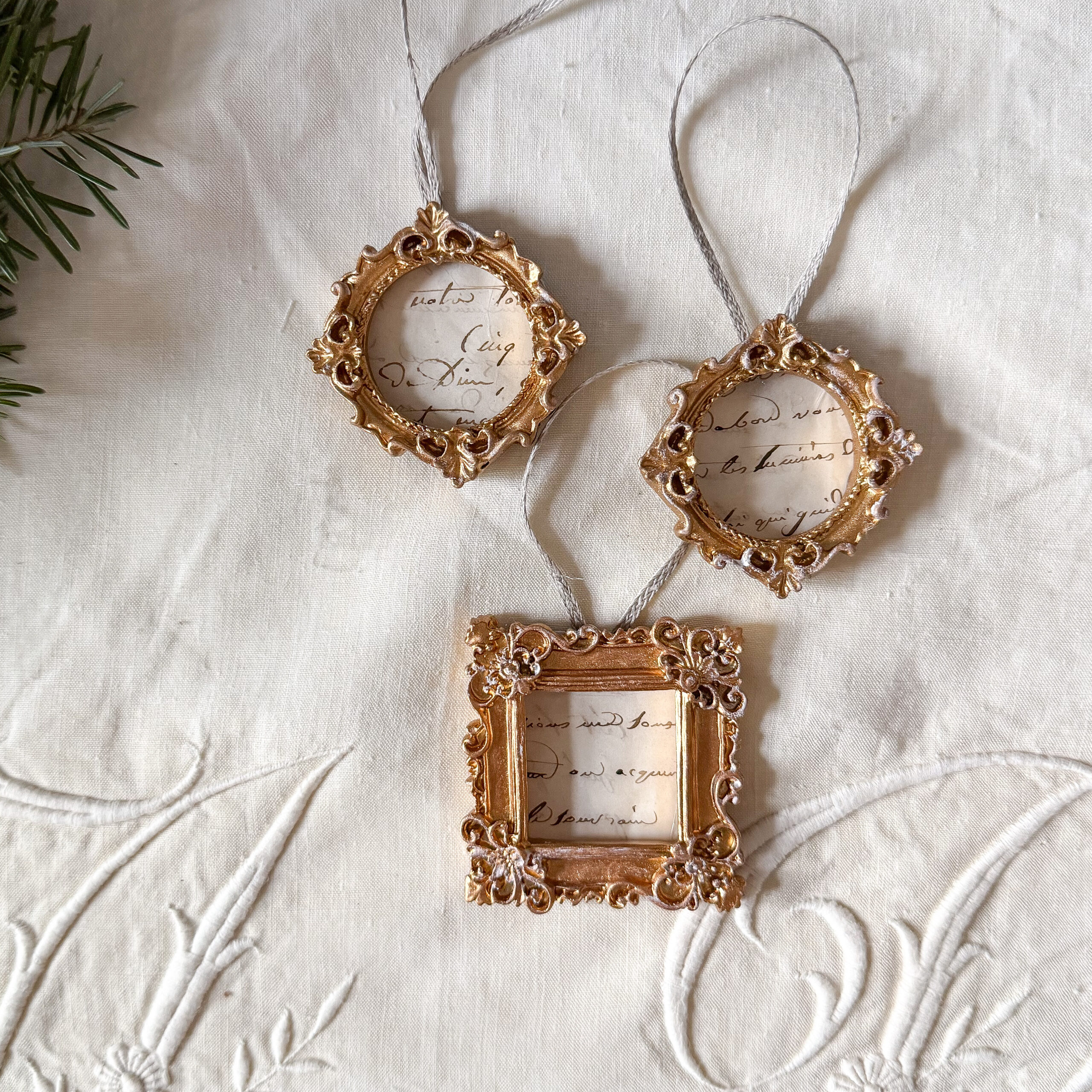 This set of ornaments was created using parts of an antique French handwritten letter. The frames are modern day and measure the tallest 2 inches and the widest 2 inches. These are handmade and each is unique and could have small imperfections. These are offered with free shipping in the US. Colors may appear slightly different in person.