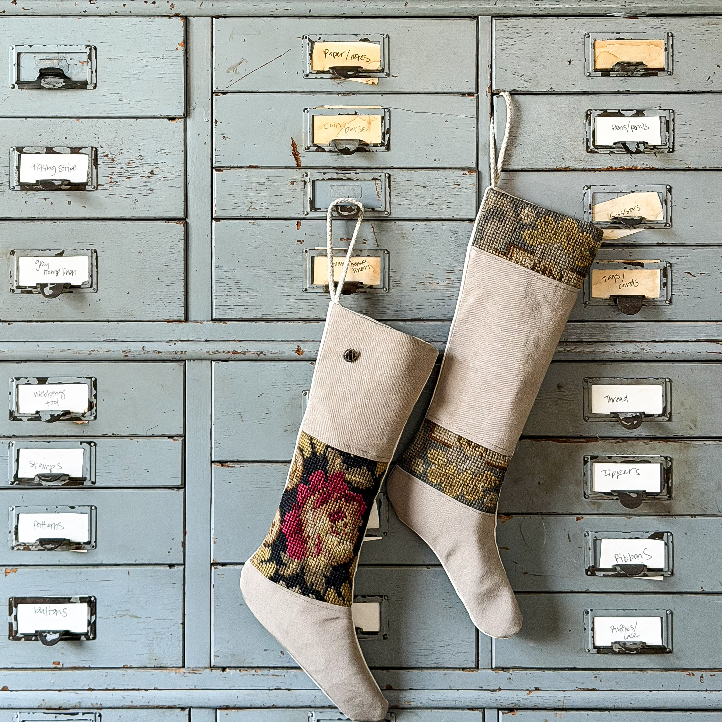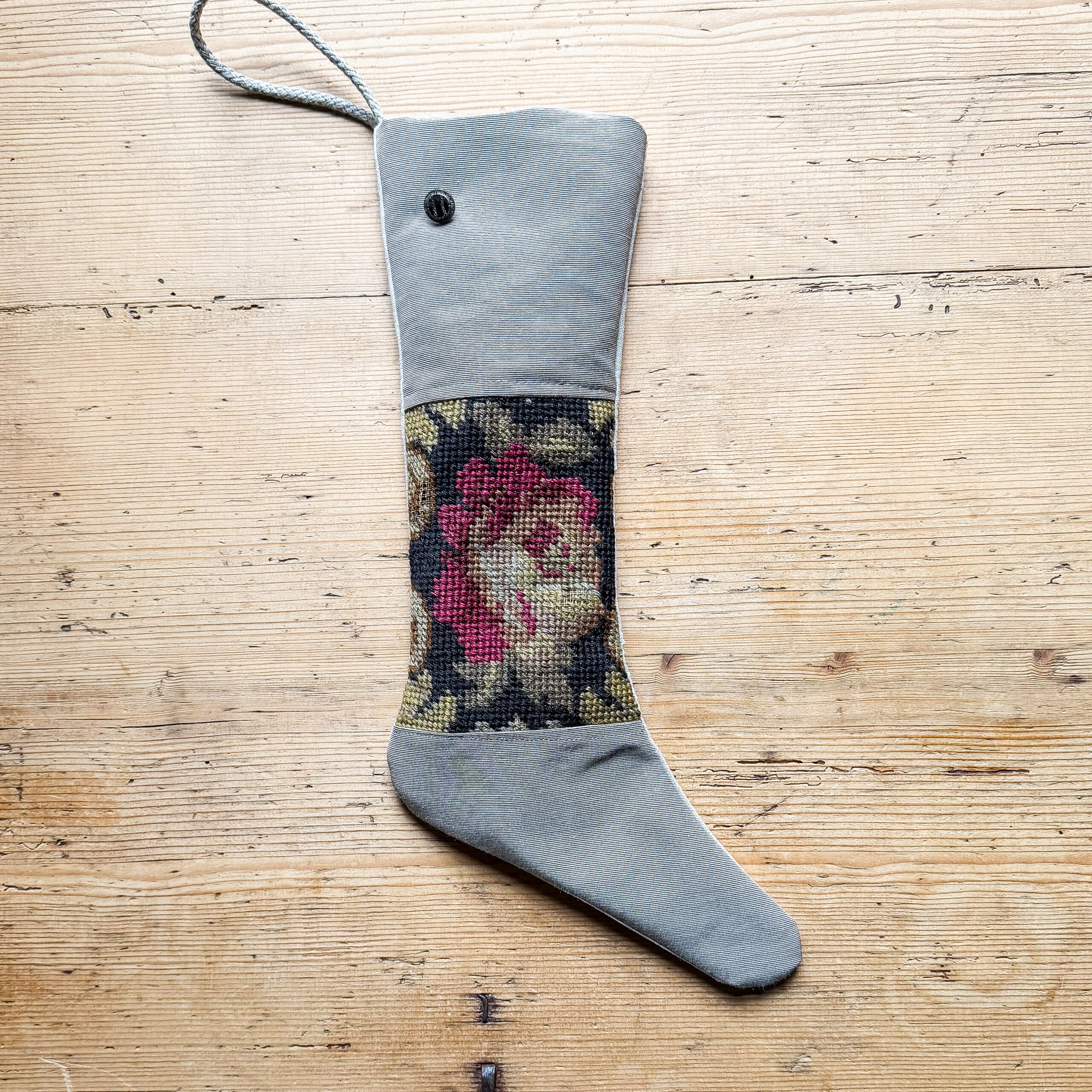 This stocking was handmade from a vintage needlepoint pieced together with vintage European fabric that is similar to grosgrain ribbon .  It measures approximately 5 inches across and 15 inches long without the string.  Because this is handmade from fabric with a history there are many worn areas and could be stains, discoloration, or repairs .  Colors may appear slightly different in person.  This comes with FREE SHIPPING in the United States.  If you would like a quote for international shipping, please send me an email.