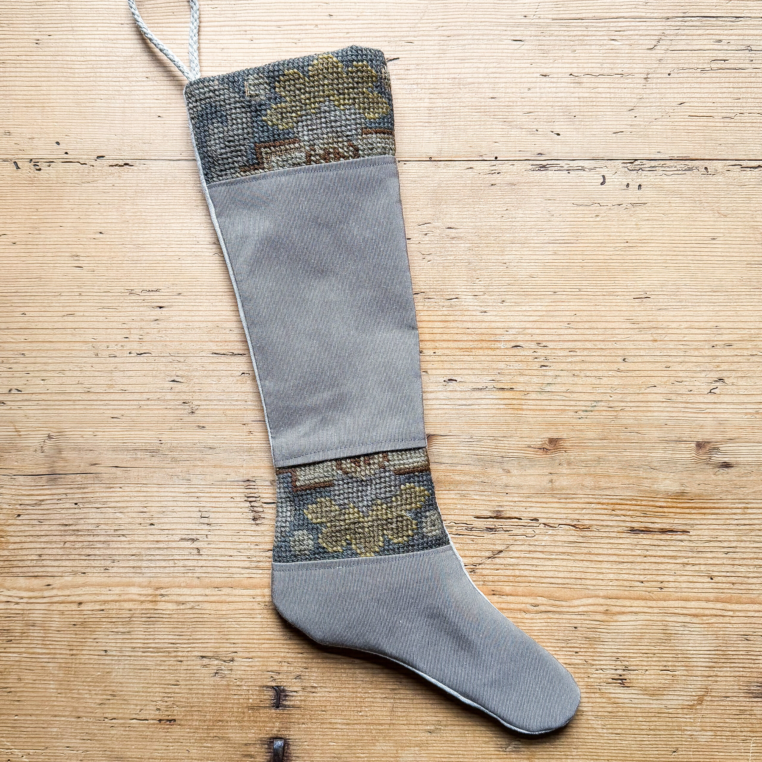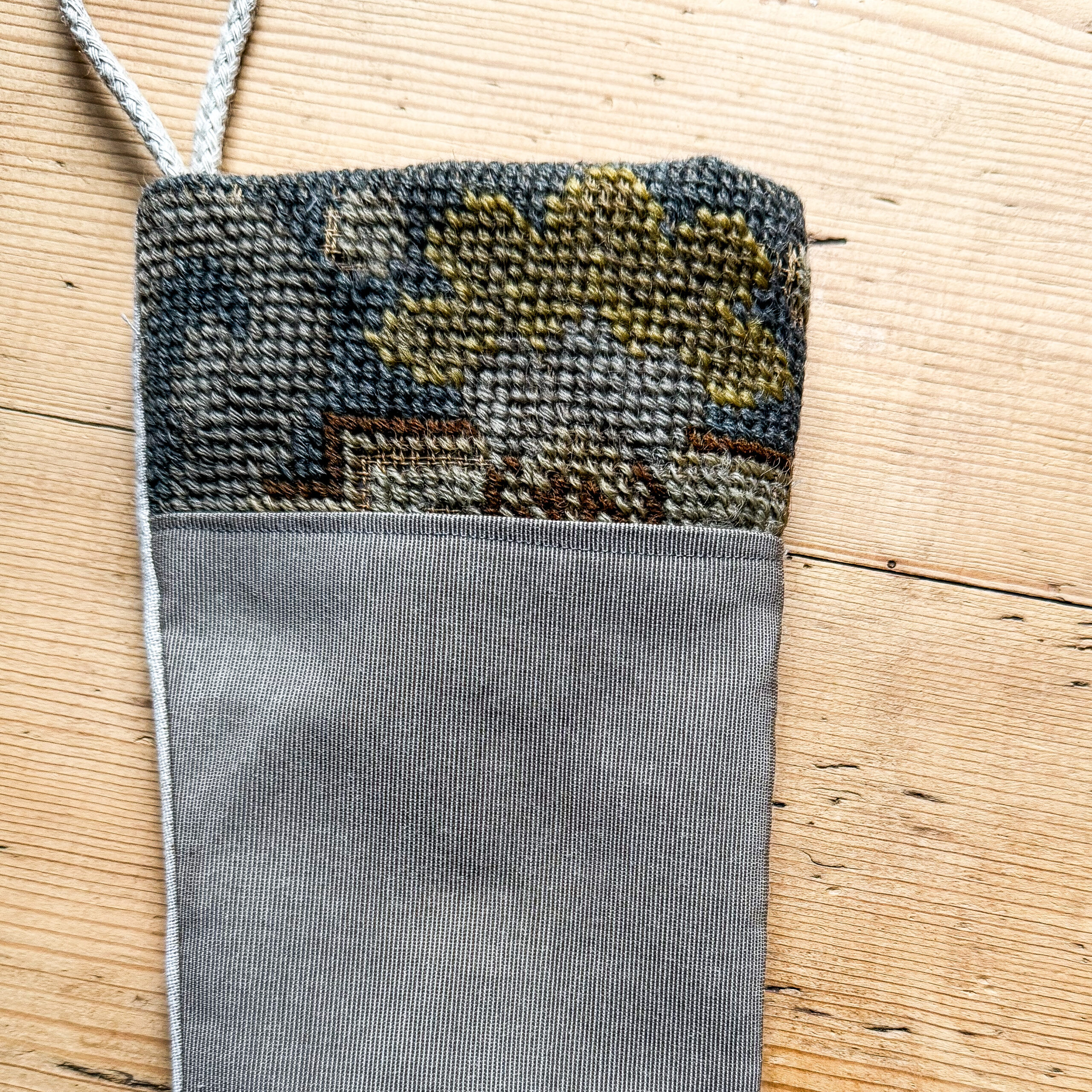 This stocking was handmade from a vintage needlepoint pieced together with vintage European fabric that is similar to grosgrain ribbon.  It measures approximately 5 inches across and 16 inches long without the string.  Because this is handmade from fabric with a history there are worn areas and could be stains, discoloration, or repairs .  Colors may appear slightly different in person.  This comes with FREE SHIPPING in the United States.  If you would like a quote for international shipping, please send me an email.