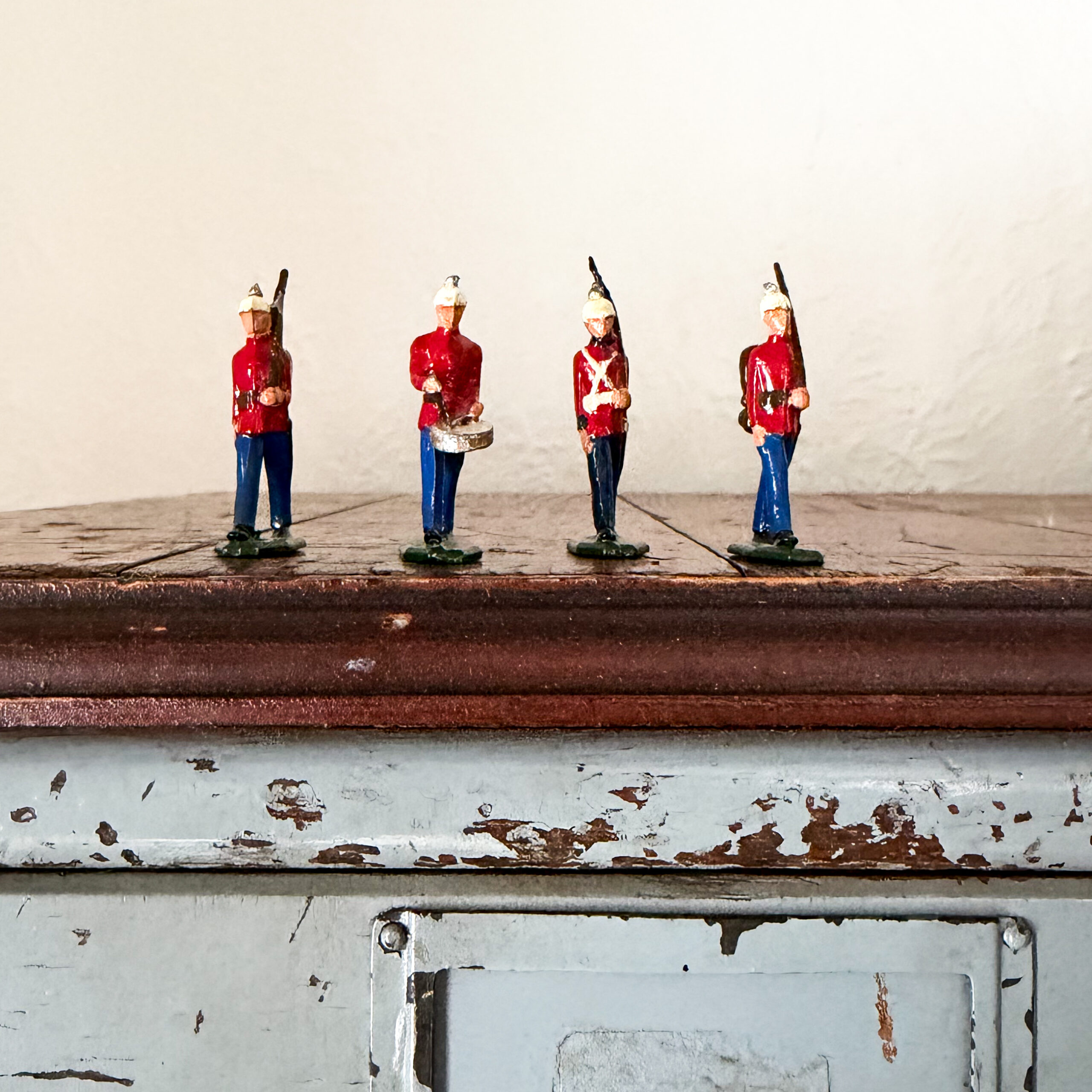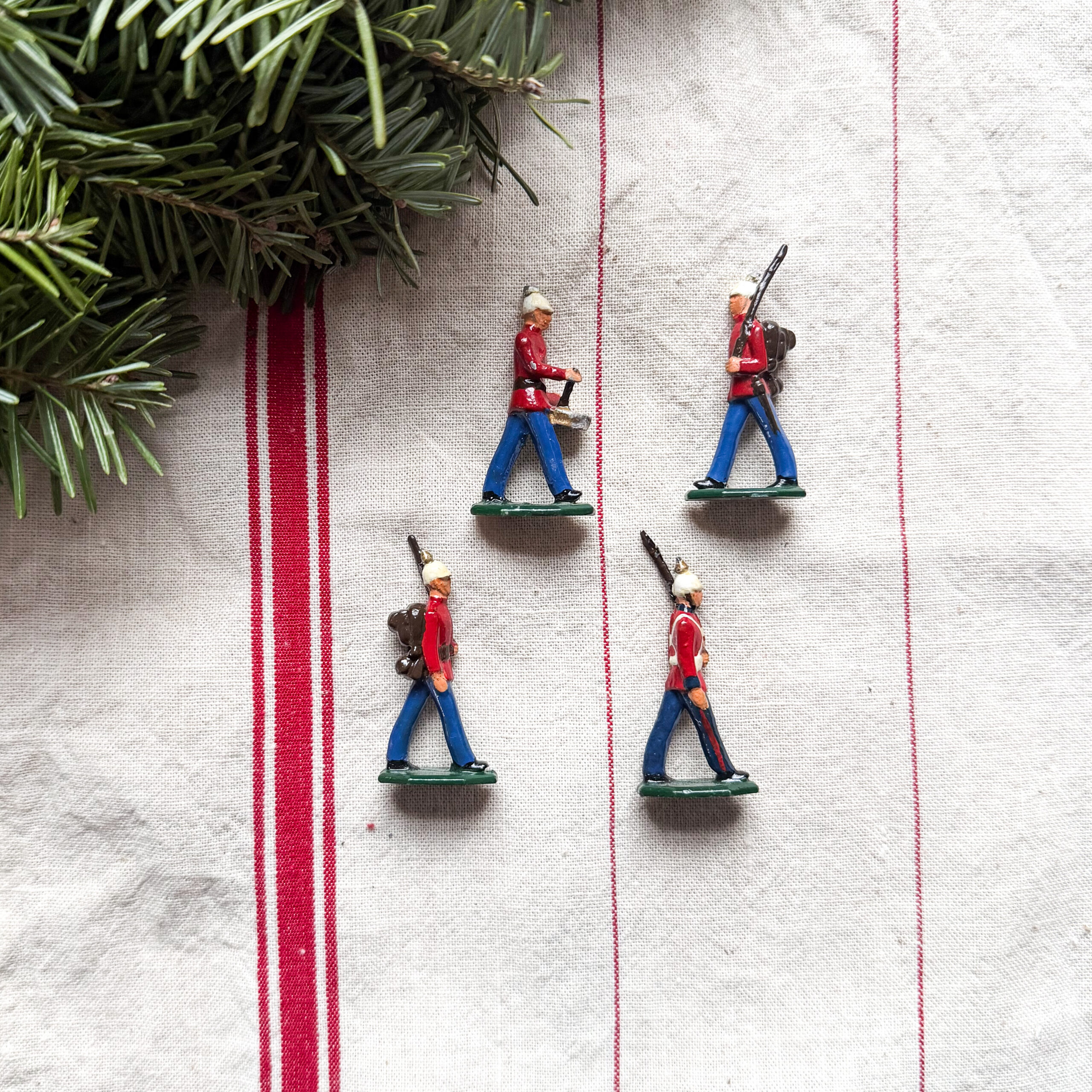 These tiny vintage soldiers were found in England.  They measure approximately 1 3/4 inches high.  These are for decor purposes only, as the paint is old, DO NOT USE FOR TOYS.  These have charming imperfections due to the age such as chipping of the paint and possibly broken swords or guns.  The colors may appear slightly different in person.  These are offered with free shipping in the US.