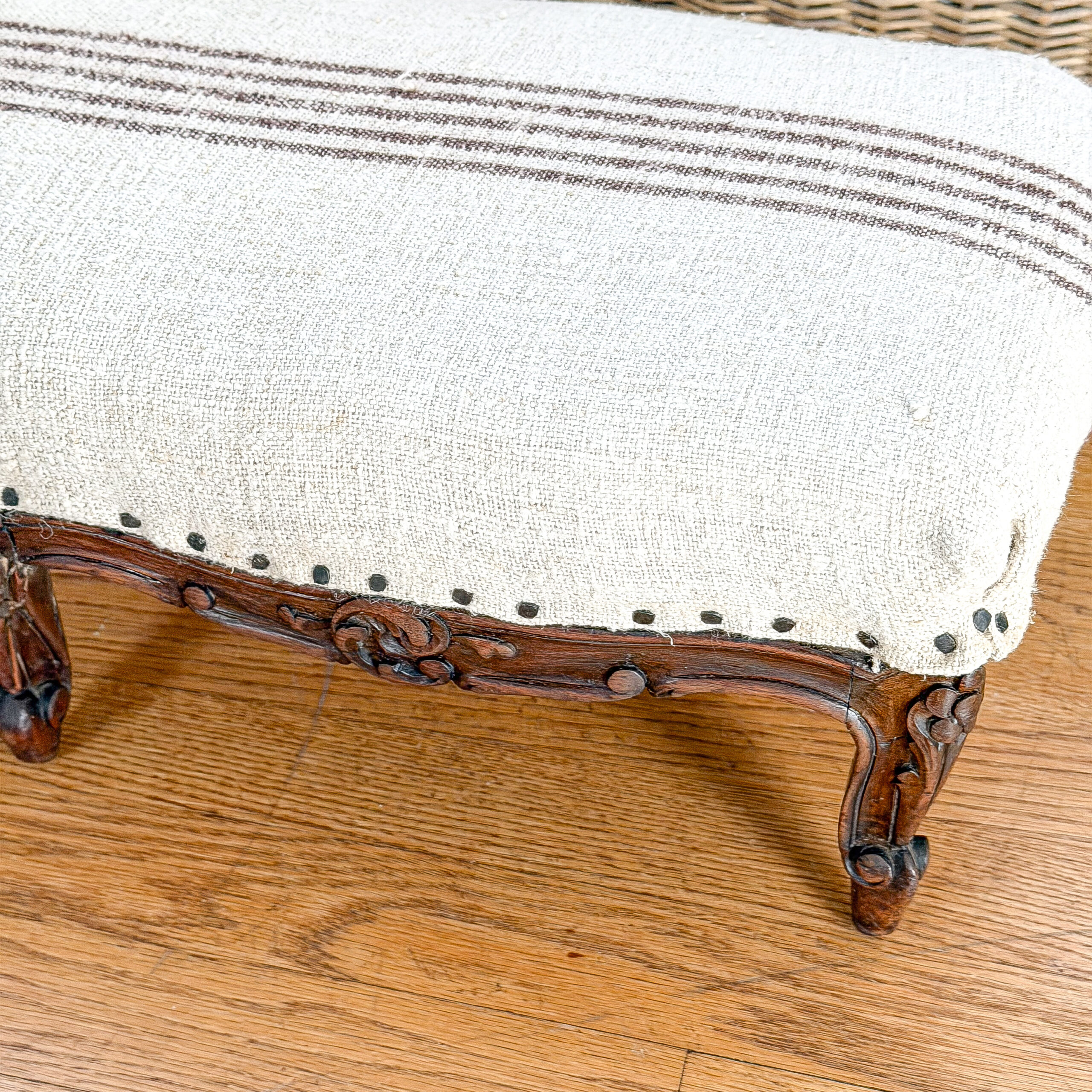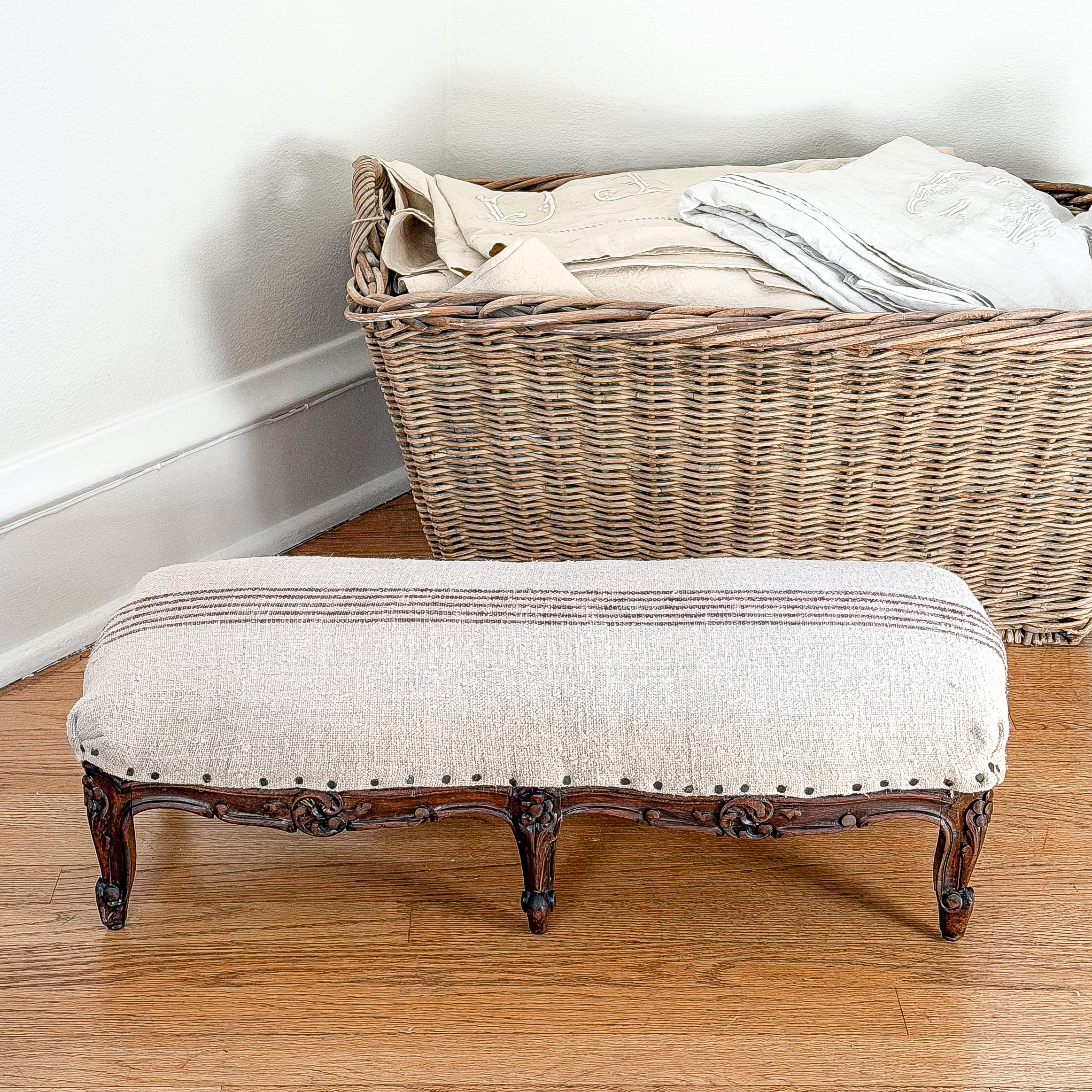 This vintage footstool has two looks, one with a slipcover and one without. The slipcover was handcrafted with an antique French sheet and upholstered with European hemp grain sack with the unusual brown stripes. It measures approximately 26 inches wide, 12 inches deep, and 8 inches high. This footstool has a history of so there are imperfections such as minor chips and discolorations, it has some repairs but is completely solid. This was created with a fabric with a history so there could be imperfections such as light stains, and repairs. This is offered with FREE SHIPPING within the United States.