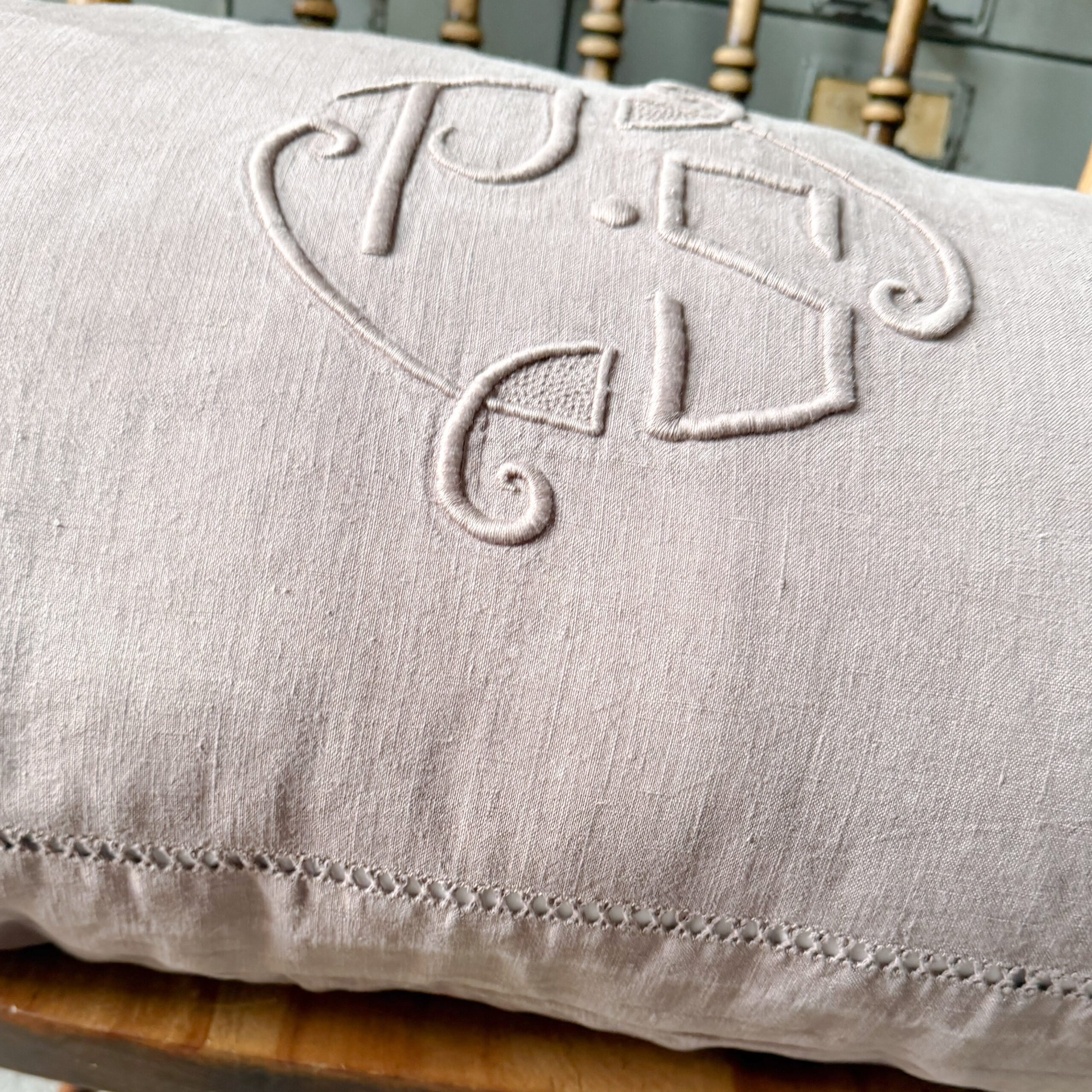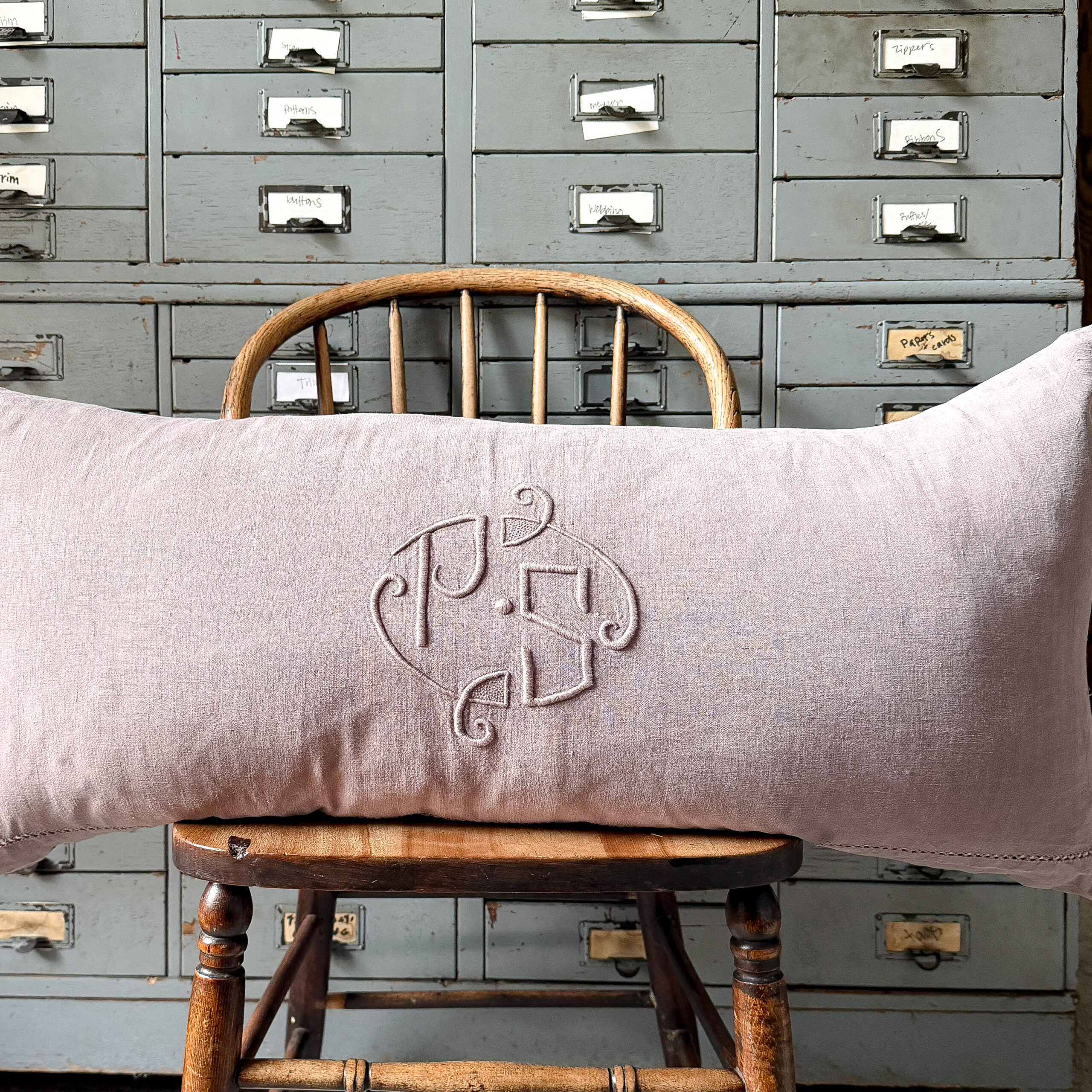This pillow was made from a piece of vintage French with the monogram of PS, this would be the initials of the original owner. The pillow measures approximately 16 by 35 inches and comes with a feather insert. This was made with fabric with the a history so there may be imperfections such as repairs, light stains, or discoloration. The color may appear slightly different in person.