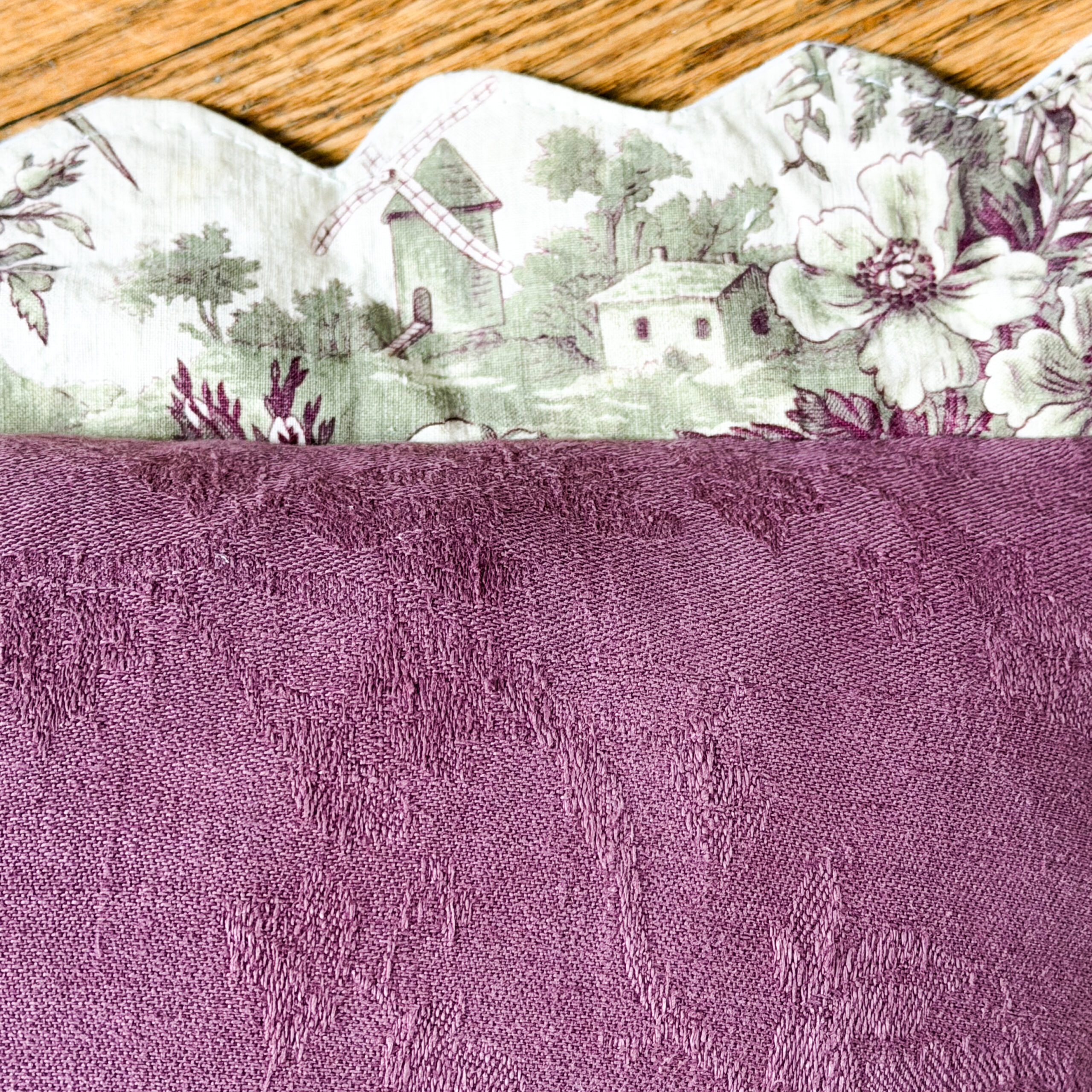 This pillow was made from a piece of vintage French fabric with a monogram AB, that would have been the original owner’s initials. There is trim detail created with a vintage French toile. The pillow measures approximately 11 by 18 inches without the trim and comes with a feather insert. The back is a plain coordinating linen with button closure. This was made with fabric with the a history so there are imperfections light stains, and may have other imperfections such as repairs or discoloration. The color may appear slightly different in person.