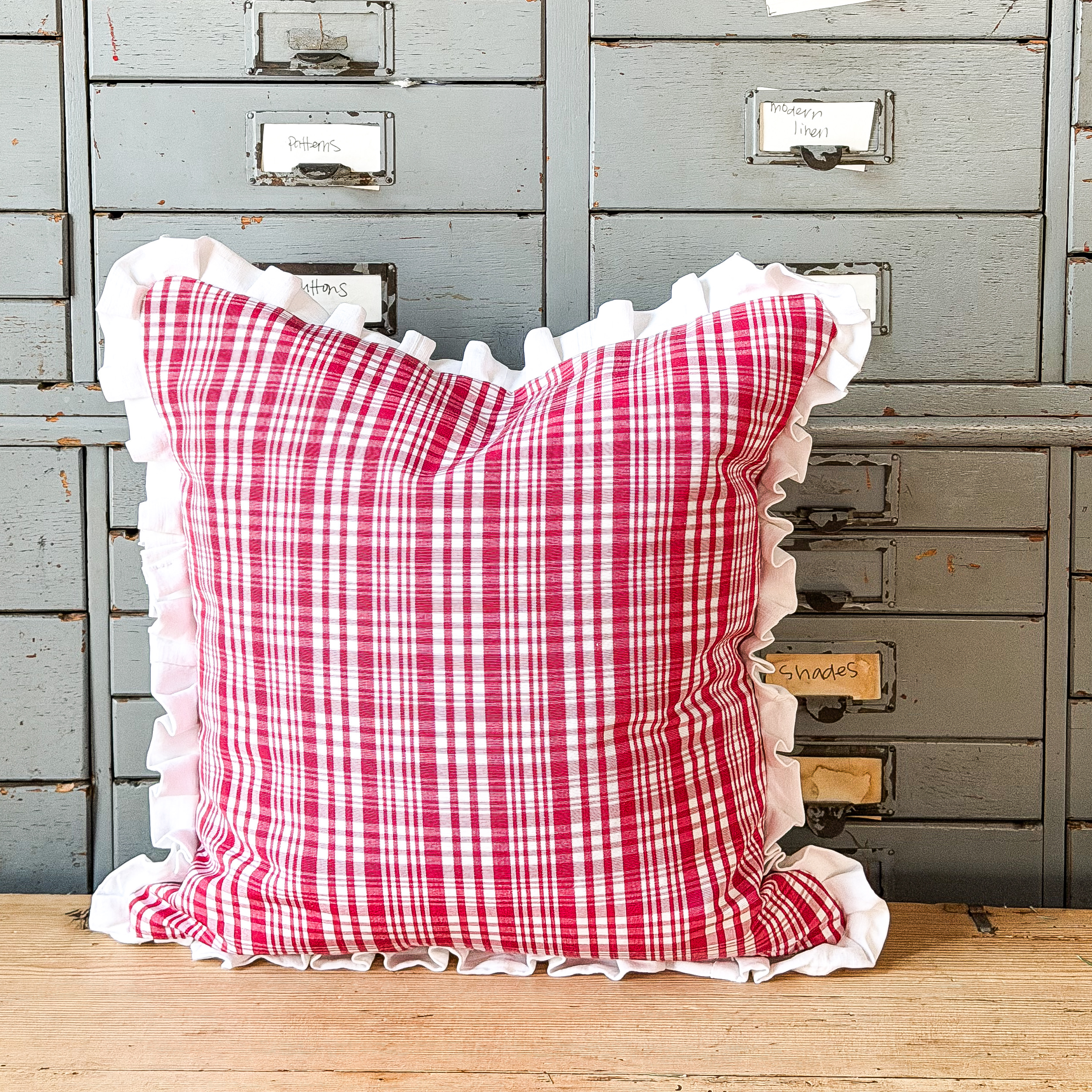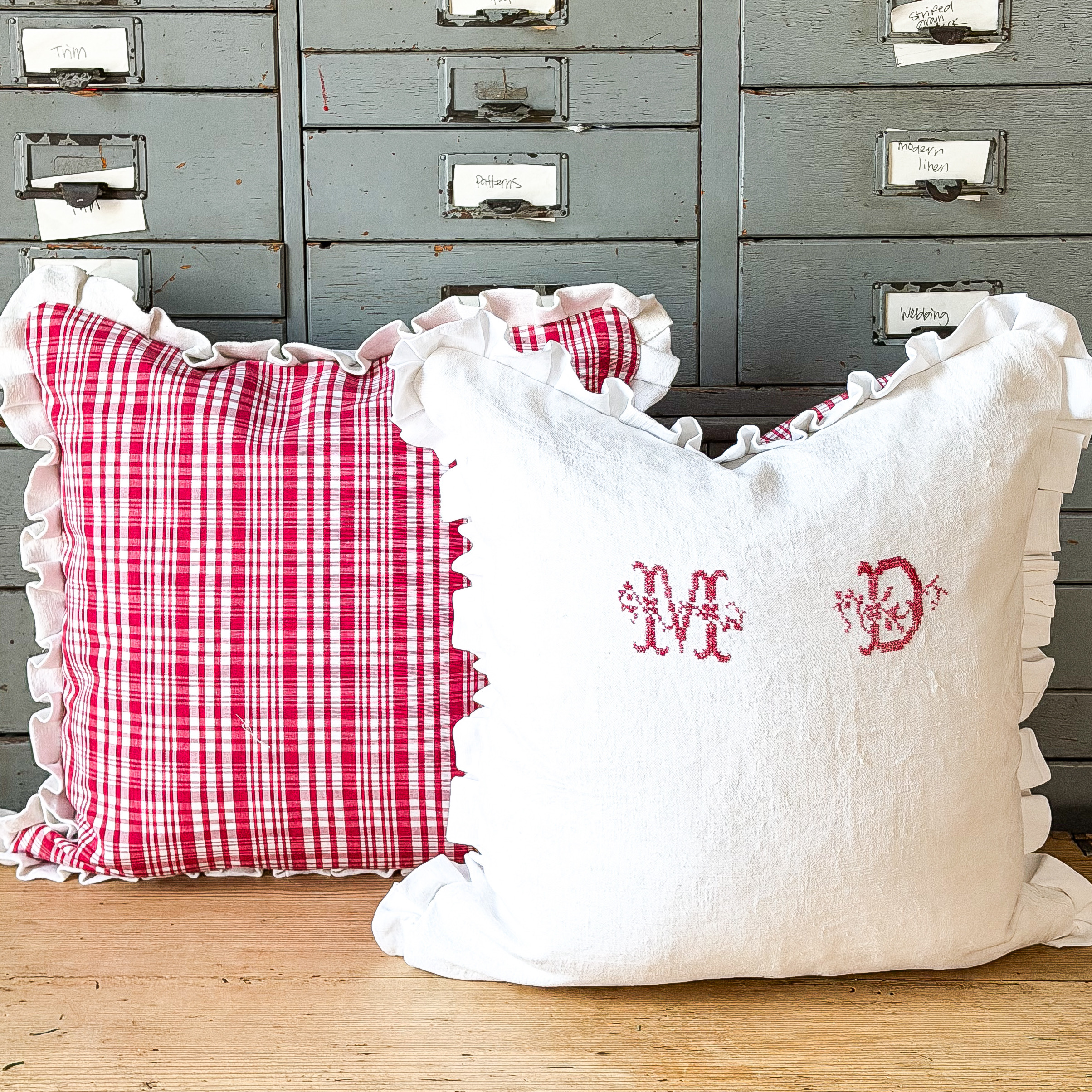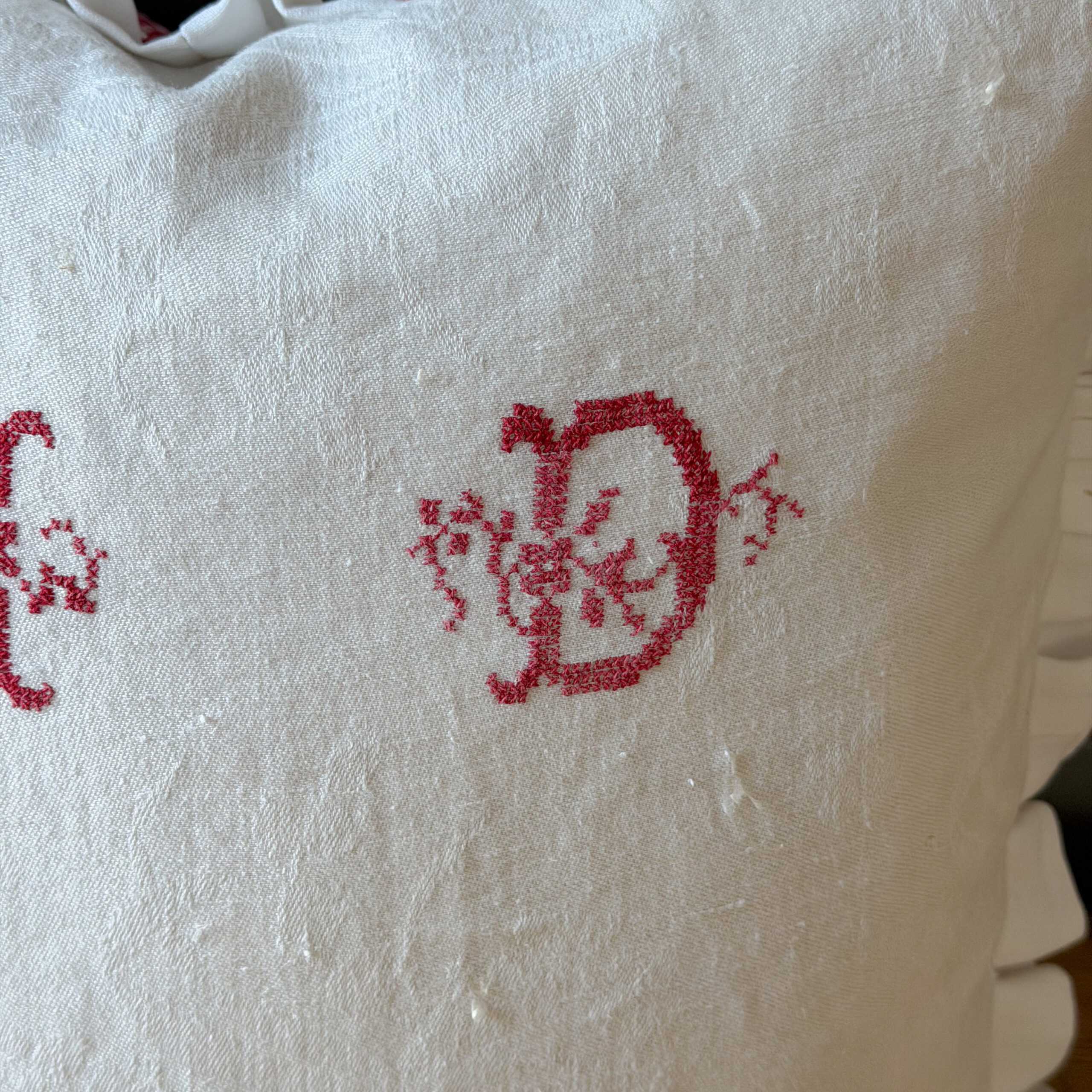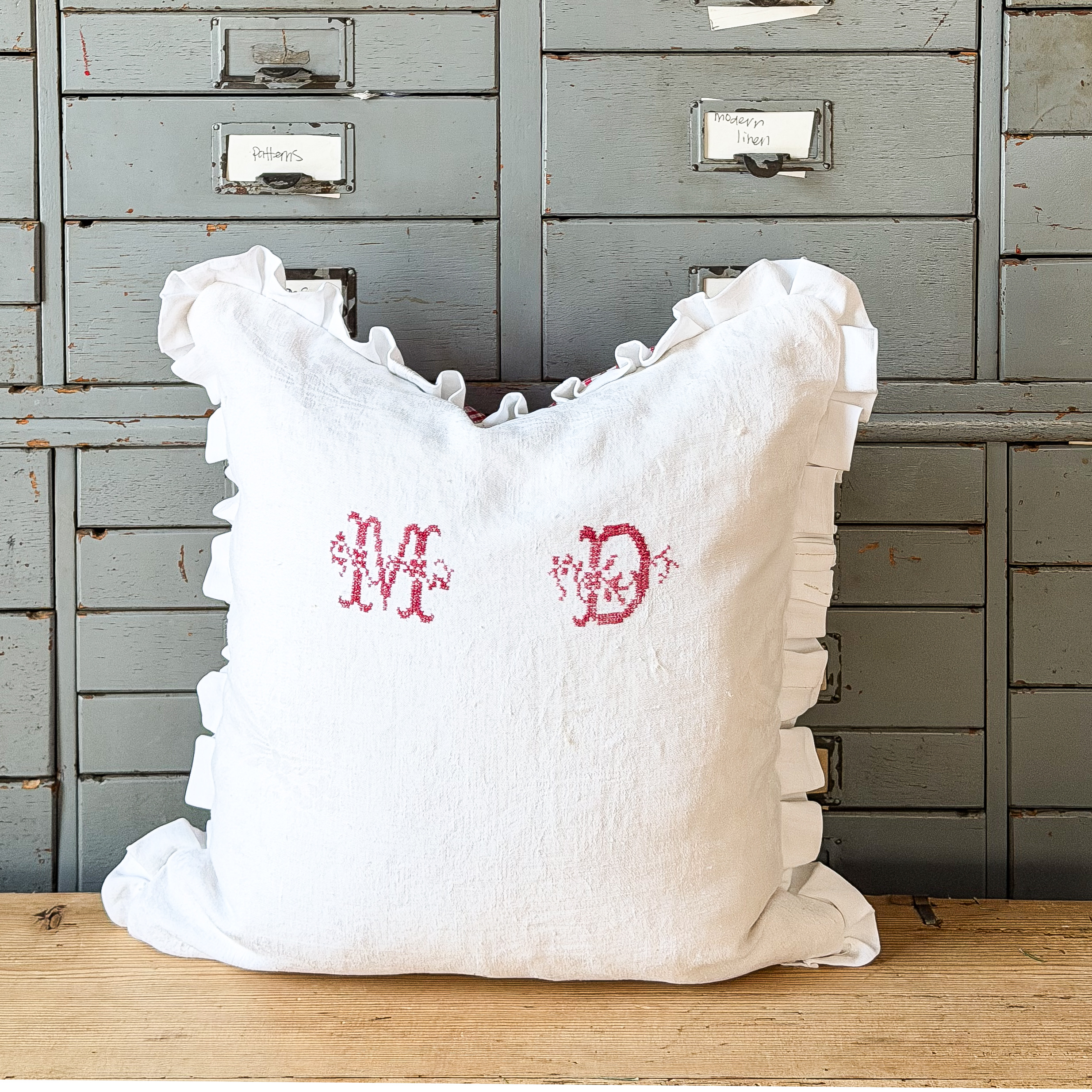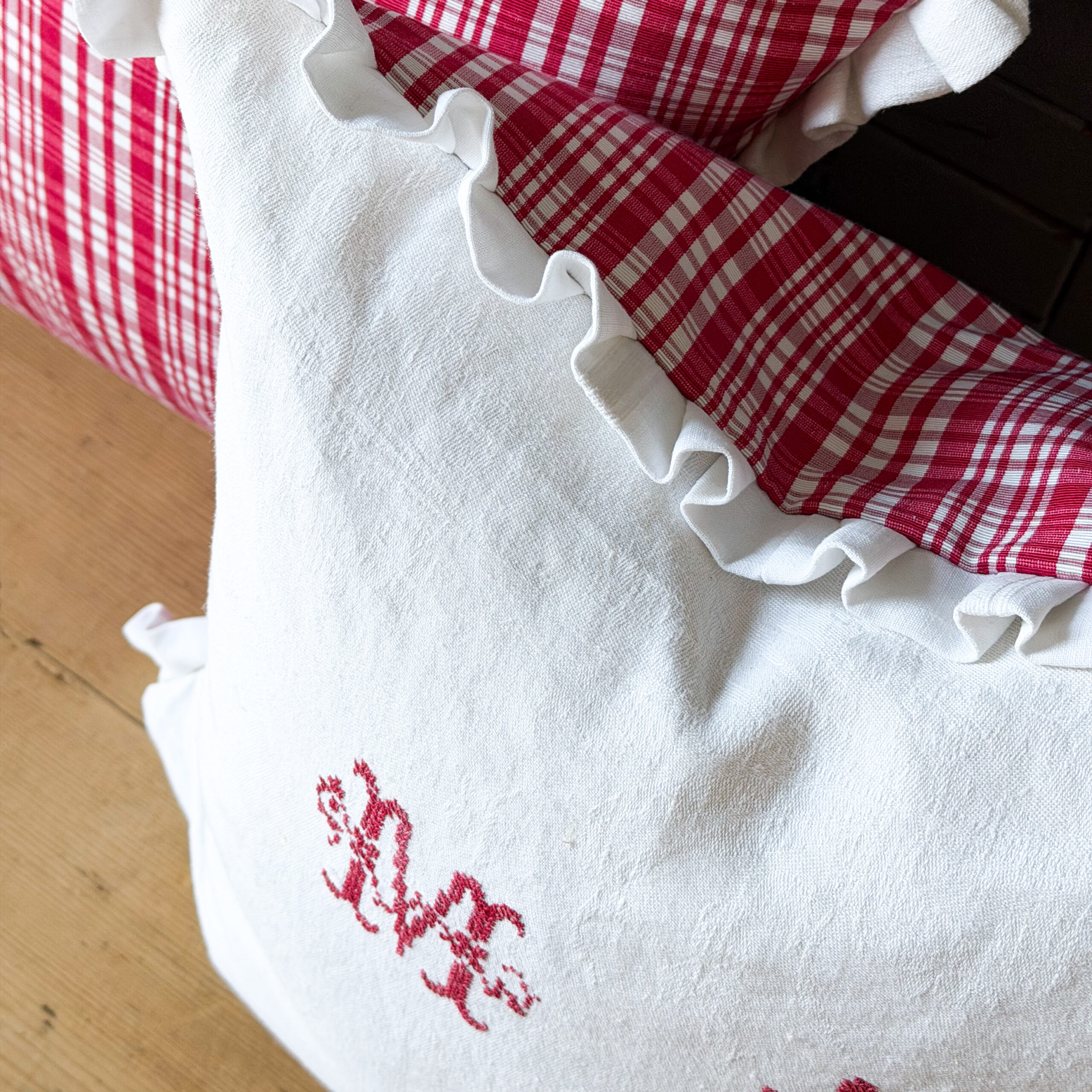 This pillow was created with two sides of vintage fabric. One side is from a vintage napkin that has the initials of the original owner. The other side was found at one of the oldest fabric stores in Paris in their vintage fabric department, the plaid is on fabric that is like grosgrain ribbon, it is lovely texture. The plaid fabric is a deep pink, light red color and is in excellent condition. The napkin side has some fading in the letters and some light stains. This pillow measure approximately 17 inches square including the ruffle and comes with a feather insert. The colors may appear slightly different in person. This is offered with free shipping in the US.
