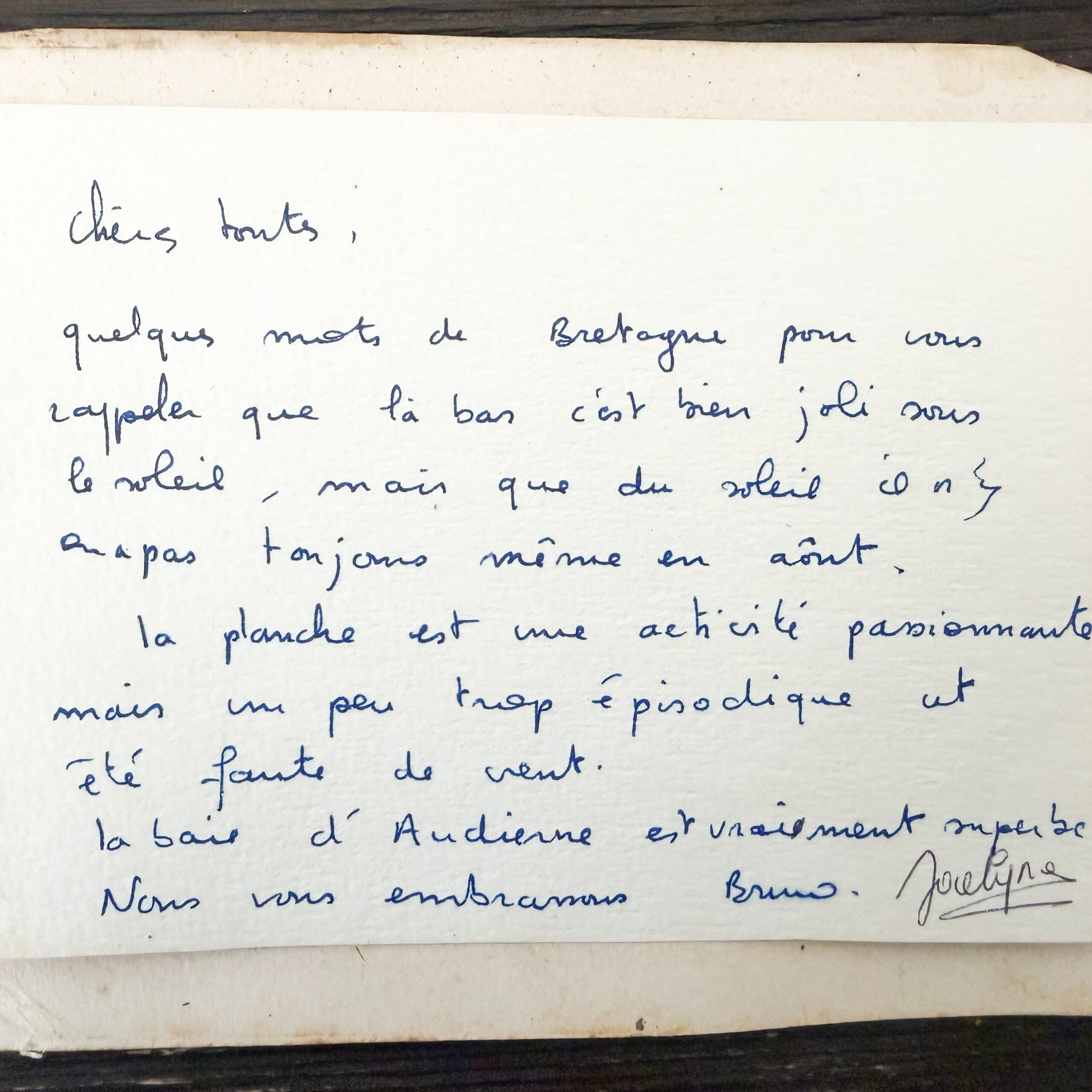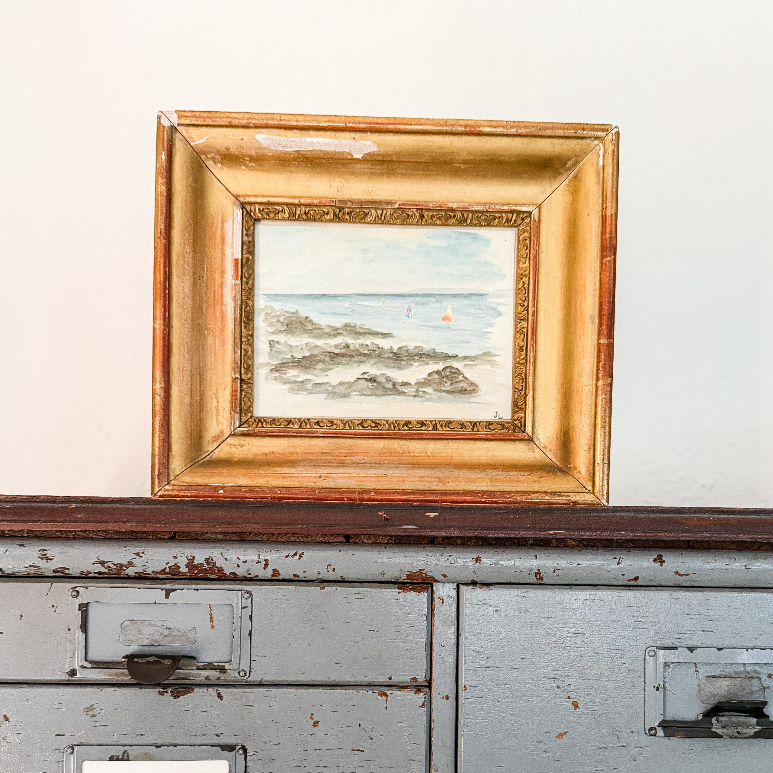 This lovely watercolor painting of a sailboat scene was found in Provence, it was is framed in a charming antique frame with signs of wear. The total measurements with the frame are 10 1/4 by 8 3/4 inches. I found on the back of the painting there was a note written by the artist, see included picture. Please note this is in found condition so it may have some imperfections such as marks or discoloration. The frame has some chips, staining, and discoloration. Also note the colors may appear slightly different in person.